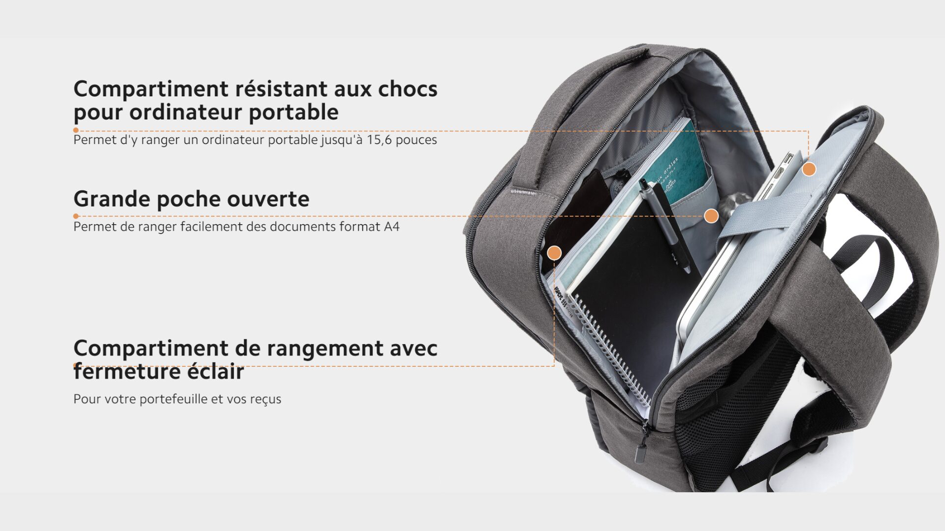 Le sac possède une contenance de 21 litres et de nombreux compartiments. Votre ordinateur est maintenu par une sangle dans un compartiment résistant aux chocs, tandis que vos affaires personnelles peuvent se loger dans le rangement situé à l’avant, ou dans la poche avec fermeture éclair invisible. Une poche latérale permet de glisser une gourde ou un sandwich jambon-beurre, idéal pour calmer rapidement une petite faim.