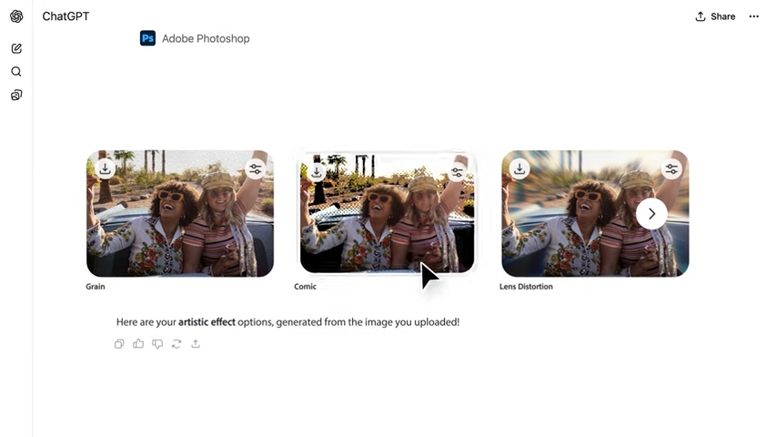 Concrètement, vous pouvez uploader une photo et demander à « Adobe Photoshop » d’ajuster la luminosité, d’appliquer un effet ou de détourer un sujet. ChatGPT s’exécutera et vous proposera d’interagir avec l’interface web de Photoshop.