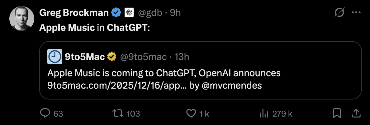 Si Fidji Simo, probablement sur demande d’Apple, a rapidement supprimé la mention d’Apple Music de son billet de blog, Greg Brockman, le président cofondateur d’OpenAI, semble ne pas avoir eu le mémo.
