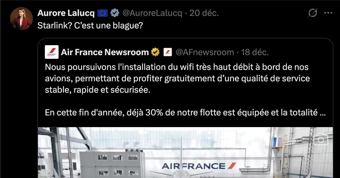 Quinze mois après l’annonce d’Air France, le week-end du 20 décembre 2025, la sphère politique a basculé dans un monde parallèle. À la suite d’une publication du service presse d’Air France, qui fait habituellement très peu de vues (mais qui a eu le droit à un retweet d’Elon Musk), de nombreuses personnalités politiques se sont attaquées à la compagnie, à qui ils reprochent de « choisir le Starlink de Musk » (sans oublier plusieurs articles dans des médias qui avaient pourtant déjà couvert l’annonce).