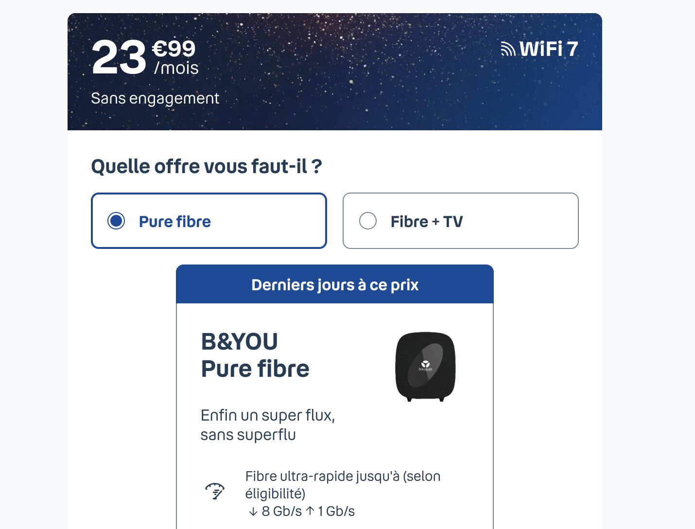 Sur le marché des box internet, l’offre B&YOU Pure Fibre est sans doute la meilleure aujourd’hui. Pour 23,99 euros par mois, Bouygues propose une box Wi-Fi 7 tribandes, 8 Gbit/s descendant et 1 Gbit/s montant. C’est la meilleure offre pour les personnes qui disposent déjà d’un téléviseur connecté et qui utilisent des applications.