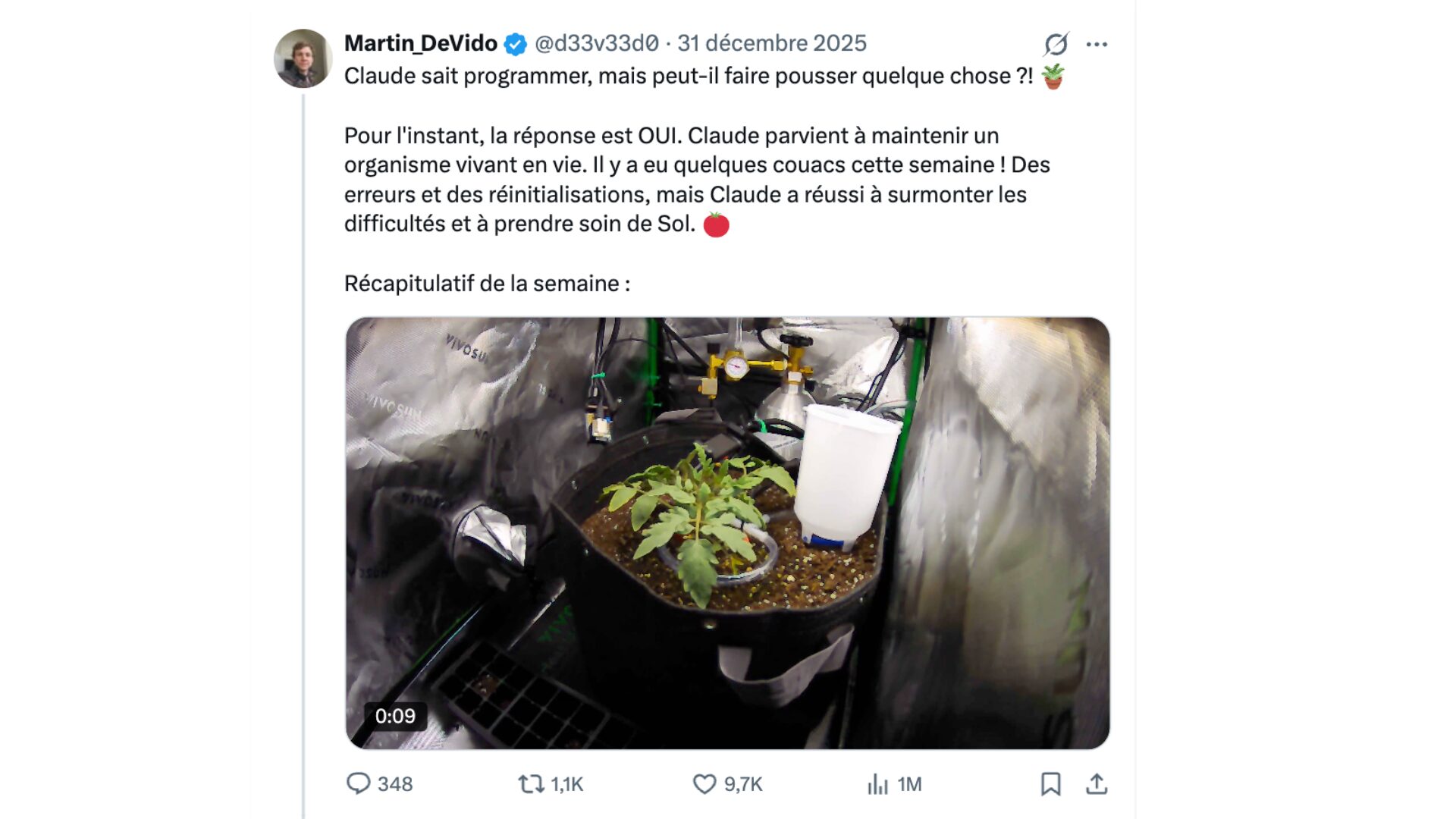 Claude a visiblement la main verte. L’IA d’Anthropic est parvenue à maintenir un organisme vivant en vie, selon une expérience publiée sur X le 31 décembre 2025. Mais comment une intelligence artificielle pourrait-elle bien s’occuper d’un petit plant de tomate pendant un mois ? C’est précisément ce qu’a voulu tester Martin DeVido, développeur web, en menant une expérience consistant à garder la plante en vie pendant plus d’un mois, sans intervention humaine directe. Malgré quelques bugs en cours de route, le pari est visiblement réussi.