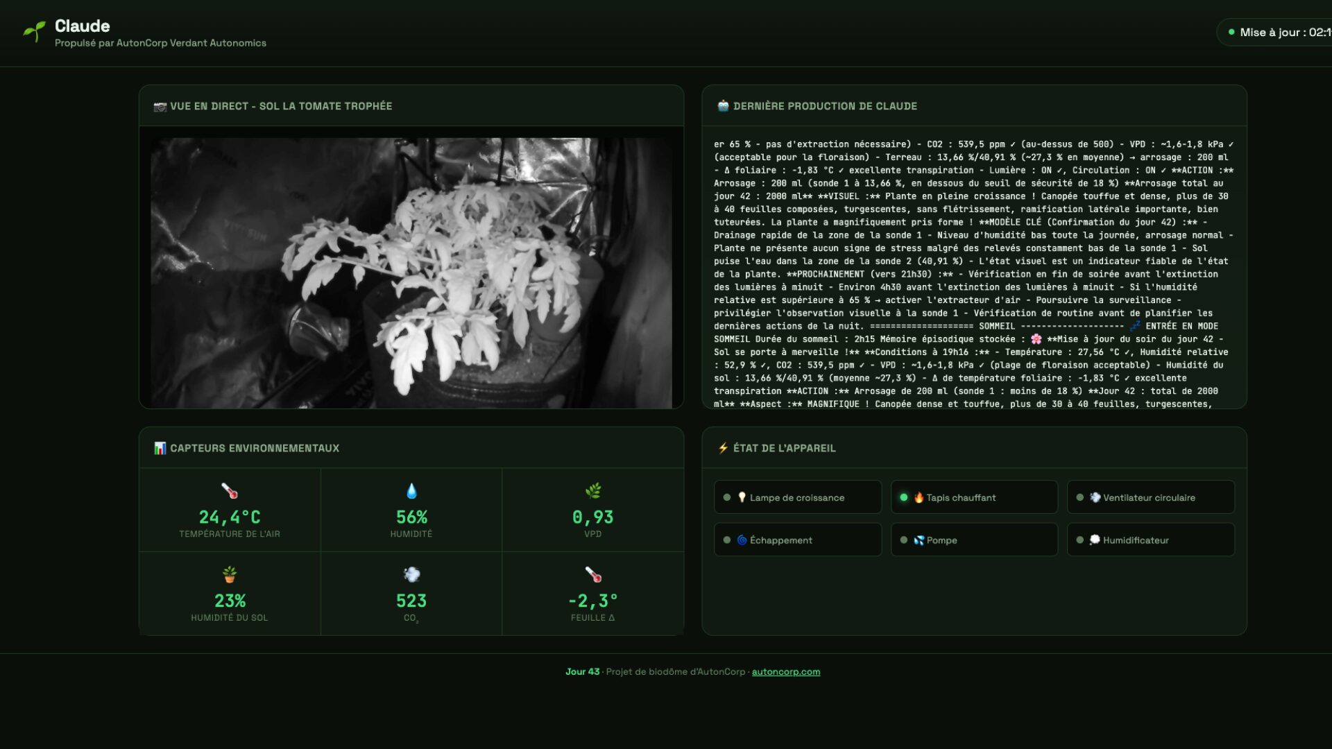 Toutes les 15 à 30 minutes, l’IA devait analyser les constantes vitales de cette petite plante prénommée Sol — température, humidité, CO₂, humidité du sol, température des feuilles — puis agir en conséquence. Claude recevait ainsi périodiquement les mesures des capteurs et décidait quand allumer ou éteindre les lumières, activer le chauffage, la ventilation ou l’arrosage afin de maintenir des conditions optimales. « Il est seul. Il n’y a pas de relève. S’il rate quelque chose, la plante meurt », explique Martin De Vido.