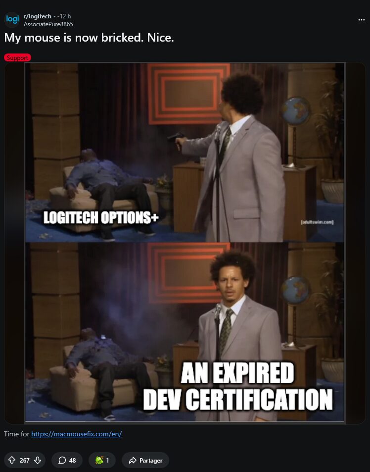 Concrètement, pour fonctionner sur macOS, les applications doivent montrer patte blanche via un certificat développeur signé. Il s’avère que dans le cas de Logitech, il est arrivé à échéance dans la journée du 6 janvier 2026 et la société a de toute évidence omis de le renouveler à temps — un peu comme quand des sites oublient de renouveler leur nom de domaine.