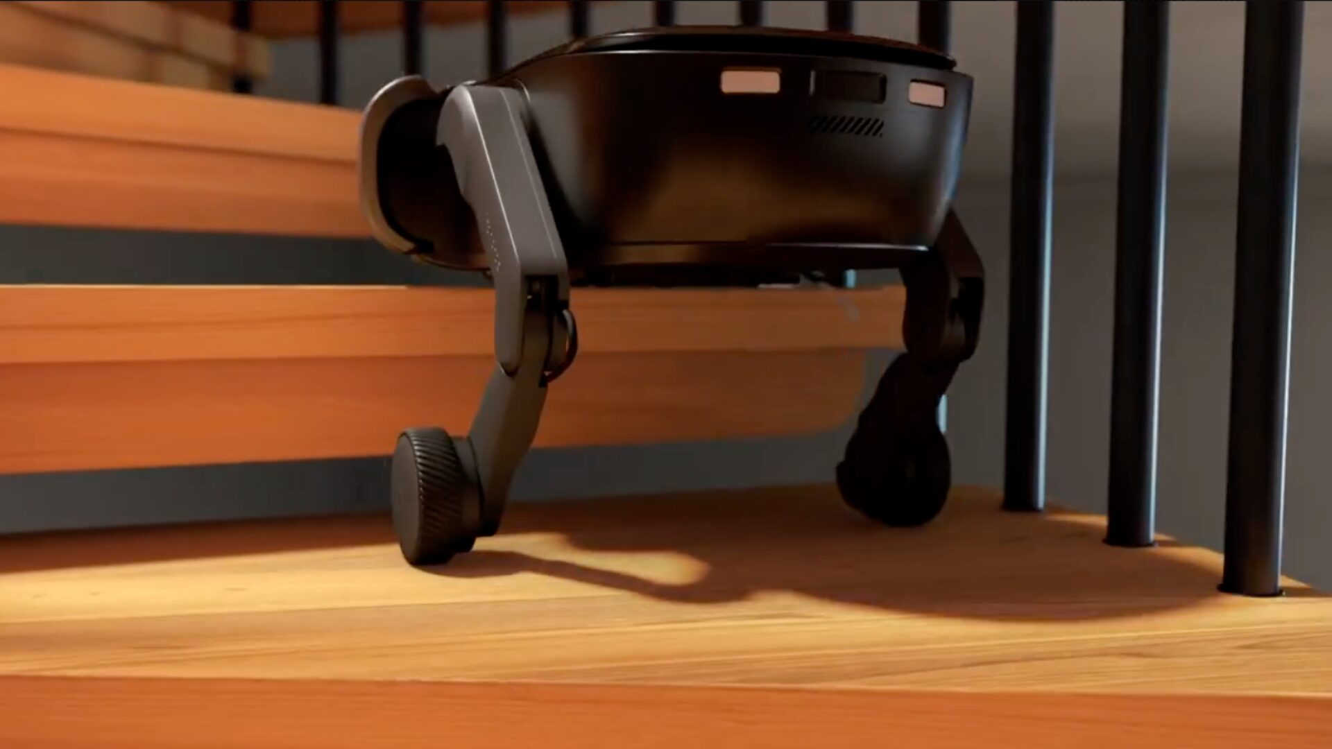 Le Saros Rover est capable de monter et descendre les escaliers grâce à ses petites « roues-jambes » (oui). Concrètement, chaque roue est montée sur une jambe articulée pouvant se lever, s’abaisser et se déplacer indépendamment, afin de maintenir le corps du robot à peu près horizontal. Cette architecture lui permet de franchir des surfaces non planes — escaliers compris — mais aussi des pentes et des seuils à plusieurs niveaux, tout en continuant à aspirer.