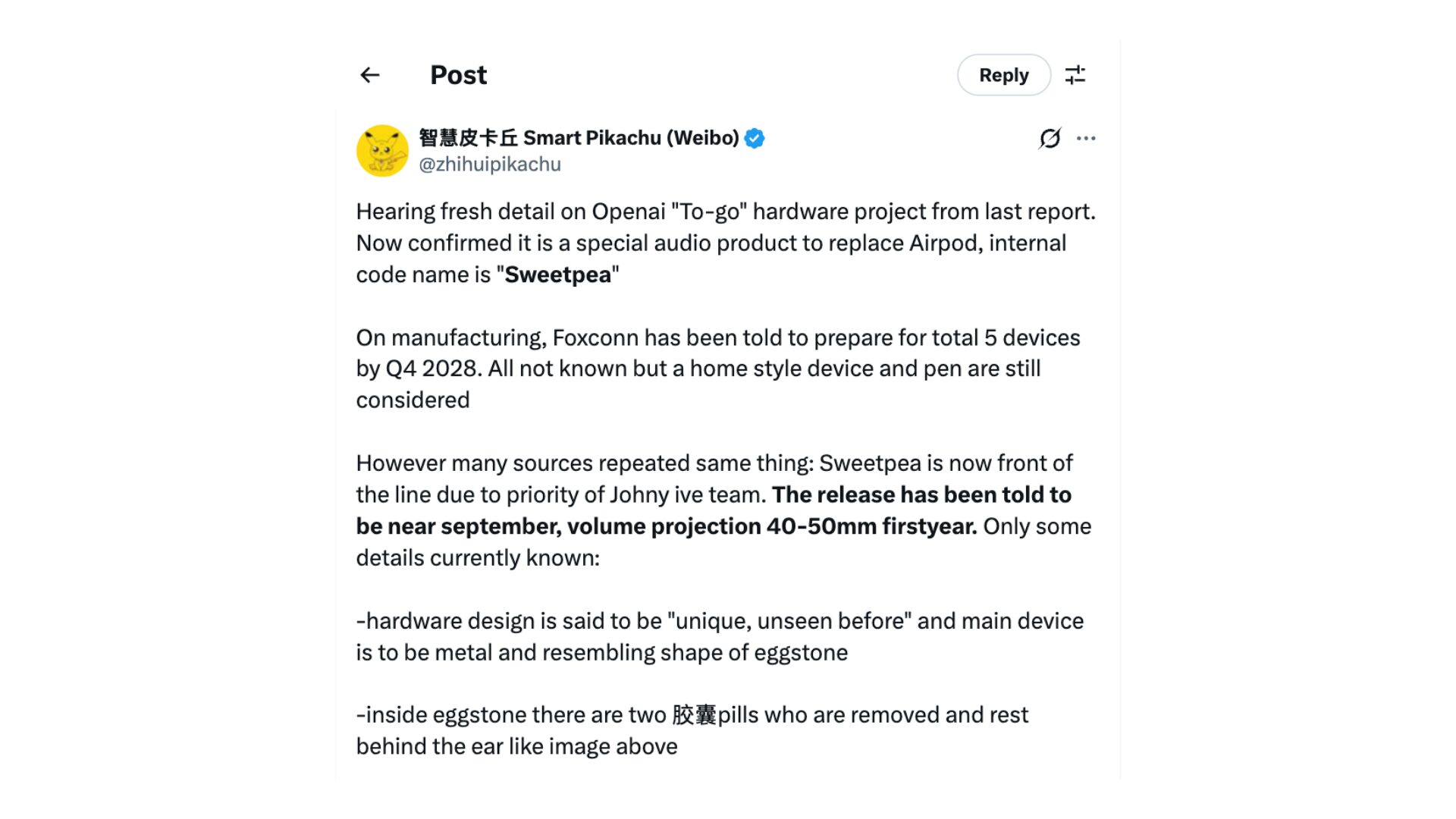 Visiblement, pour OpenAI, la Chine, c’est non. La firme de Sam Altman envisagerait plutôt une fabrication au Vietnam, voire sur le site de Foxconn aux États-Unis. À l’époque, le projet portait sur trois objets : un stylo assisté par IA, un appareil audio portable et un troisième produit aux contours encore secrets. Mais si l’on se fie au dernier message publié sur X par l’informateur, l’équipe de Jony Ive aurait finalement priorisé l’option audio. Le projet, baptisé « Sweetpea » en interne, devrait sortir en septembre avec un budget de production initial estimé entre 40 et 50 millions de dollars. Selon les sources de l’insider, le design serait « unique et inédit » : l’appareil principal, en métal, adopterait la forme d’un œuf. À l’intérieur se cacheraient deux capsules venant se placer derrière l’oreille.