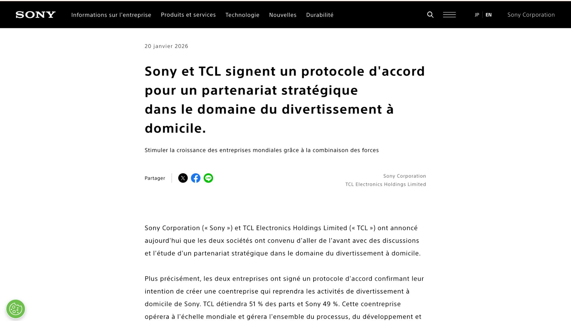 Les télévisions Sony passent, en partie, sous pavillon chinois. Dans une déclaration conjointe, le constructeur japonais Sony a annoncé, le 20 janvier 2026, avoir signé un accord avec TCL visant à créer une nouvelle coentreprise. Celle-ci reprendra l’activité « home entertainment » de Sony, à savoir les téléviseurs et une large partie de son matériel audio domestique.