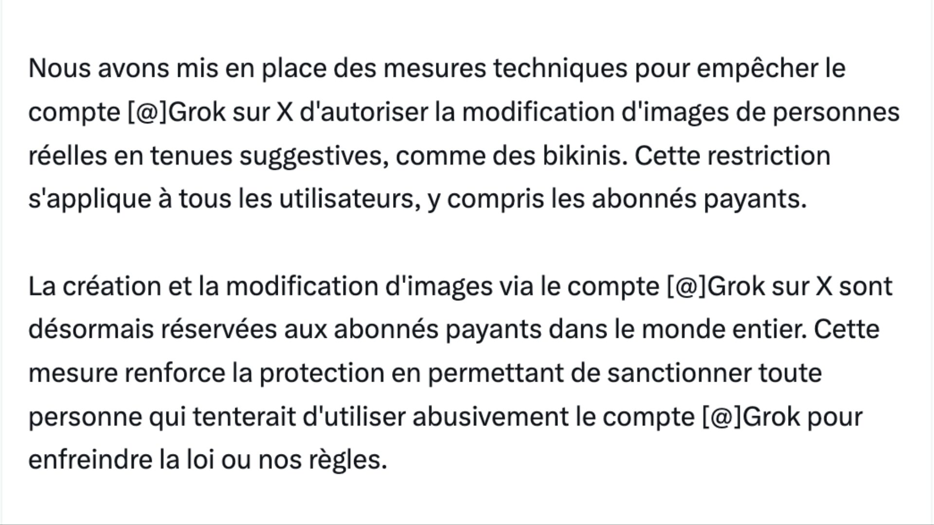 Du côté de X, qui avait dans un premier temps réservé la génération d’images aux abonnés payants — provoquant un nouveau tollé –, les premiers garde-fous commencent à apparaître. Dans un message publié sur la plateforme le 14 janvier 2026, le compte officiel @Safety, chargé de la communication autour de la « sécurité » du réseau social, a détaillé plusieurs mises à jour. « Nous avons mis en place des mesures techniques pour empêcher le compte @Grok sur X d’autoriser la modification d’images de personnes réelles en tenues suggestives, comme des bikinis », indique le communiqué. Une restriction qui s’applique « à tous les utilisateurs, y compris les abonnés payants ».