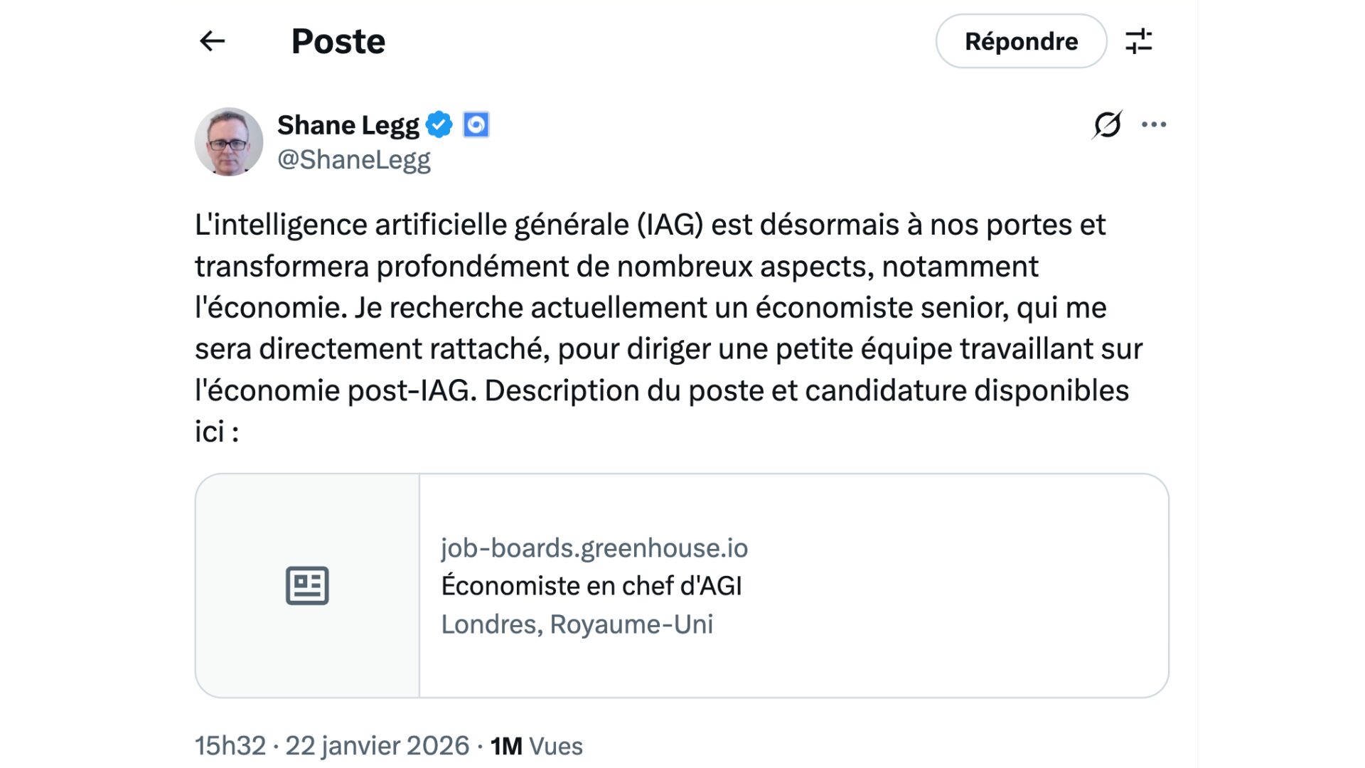 En pleine effervescence autour de l’intelligence artificielle, Google DeepMind se projette déjà dans l’après. Dans un message publié sur X le 22 janvier 2026, Shane Legg, cofondateur de DeepMind Technologies — entreprise rachetée par Google en 2014 — dévoile les ambitions de la firme. Le chercheur et entrepreneur annonce rechercher « un économiste senior, directement rattaché à [lui], pour diriger une petite équipe travaillant sur l’économie post-IAG (intelligence artificielle générale) ».