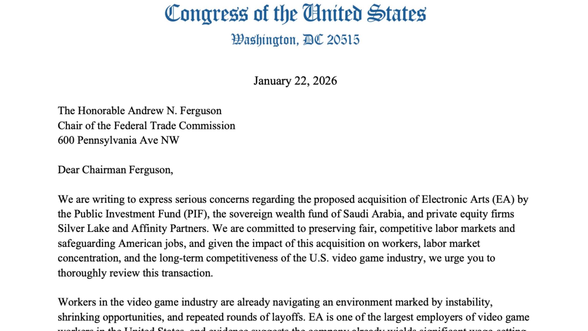 La lettre, signée par 46 démocrates de la Chambre des représentants, insiste notamment sur l’impact d’une telle acquisition sur « les travailleurs, la concentration du marché du travail et la compétitivité à long terme de l’industrie américaine du jeu vidéo. » Dans les faits, EA est l’un des plus gros employeurs du secteur aux États-Unis, dans une industrie déjà fragilisée par des vagues de licenciements et une grande instabilité : fermetures de studios, contrats précaires, restructurations à répétition.