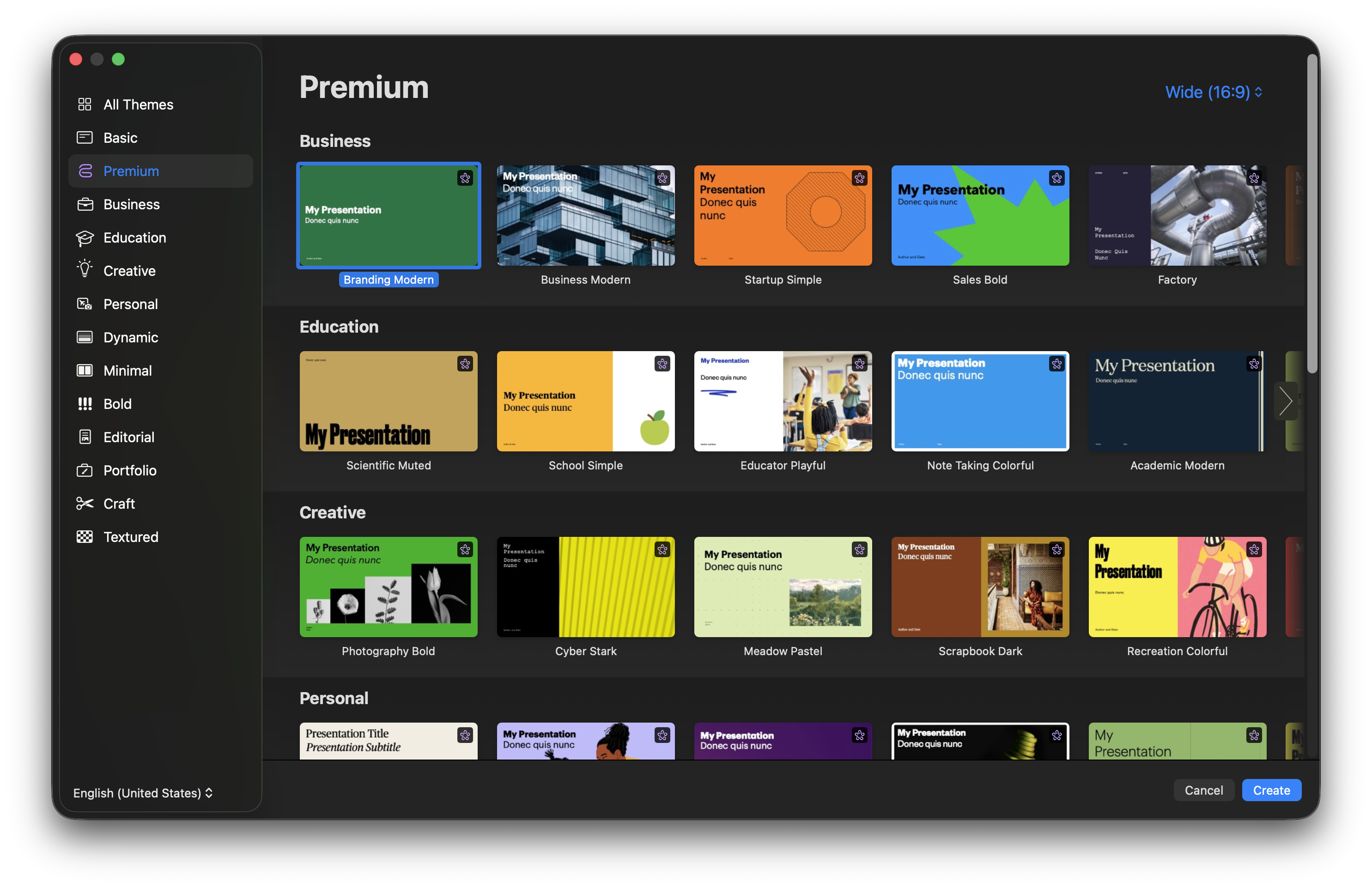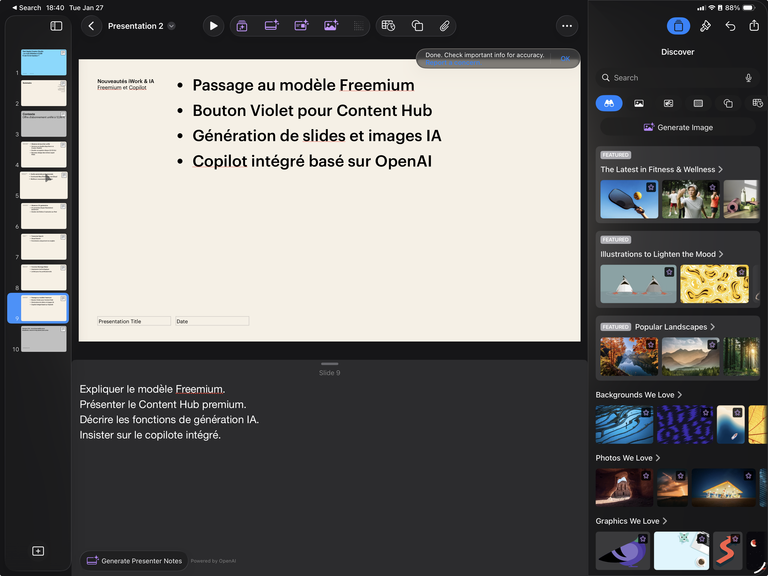 Dans Keynote, on peut désormais demander à l’IA de « nettoyer le texte », de « générer des images », de « générer des notes de présentation » ou de « générer une présentation de 10 diapositives ». Le logiciel crée la structure, remplit le texte et choisit les images. Le résultat est généralement satisfaisant, mais extrêmement simple. Il est sans le moindre doute possible de faire beaucoup mieux ailleurs (Microsoft Copilot ou Google Gemini peuvent imiter le style d’une entreprise, par exemple). On trouve aussi d’étonnants templates « Premium » : Apple réserve quelques inspirations à ses abonnés.