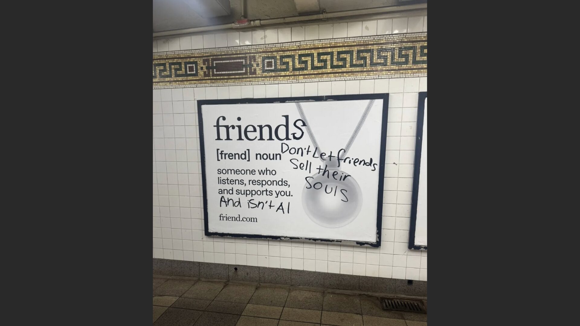 À la fin de l’été 2025, Friend a dépensé plus d’un million de dollars pour tapisser le métro new-yorkais, avec plus de 10 000 affiches déployées dans 11 000 wagons, ainsi que des panneaux en station et sur des abribus. Cette campagne a provoqué un tollé massif. De nombreuses affiches ont été arrachées ou entièrement recouvertes, au point que les images de ces dégradations sont rapidement devenues virales en ligne.