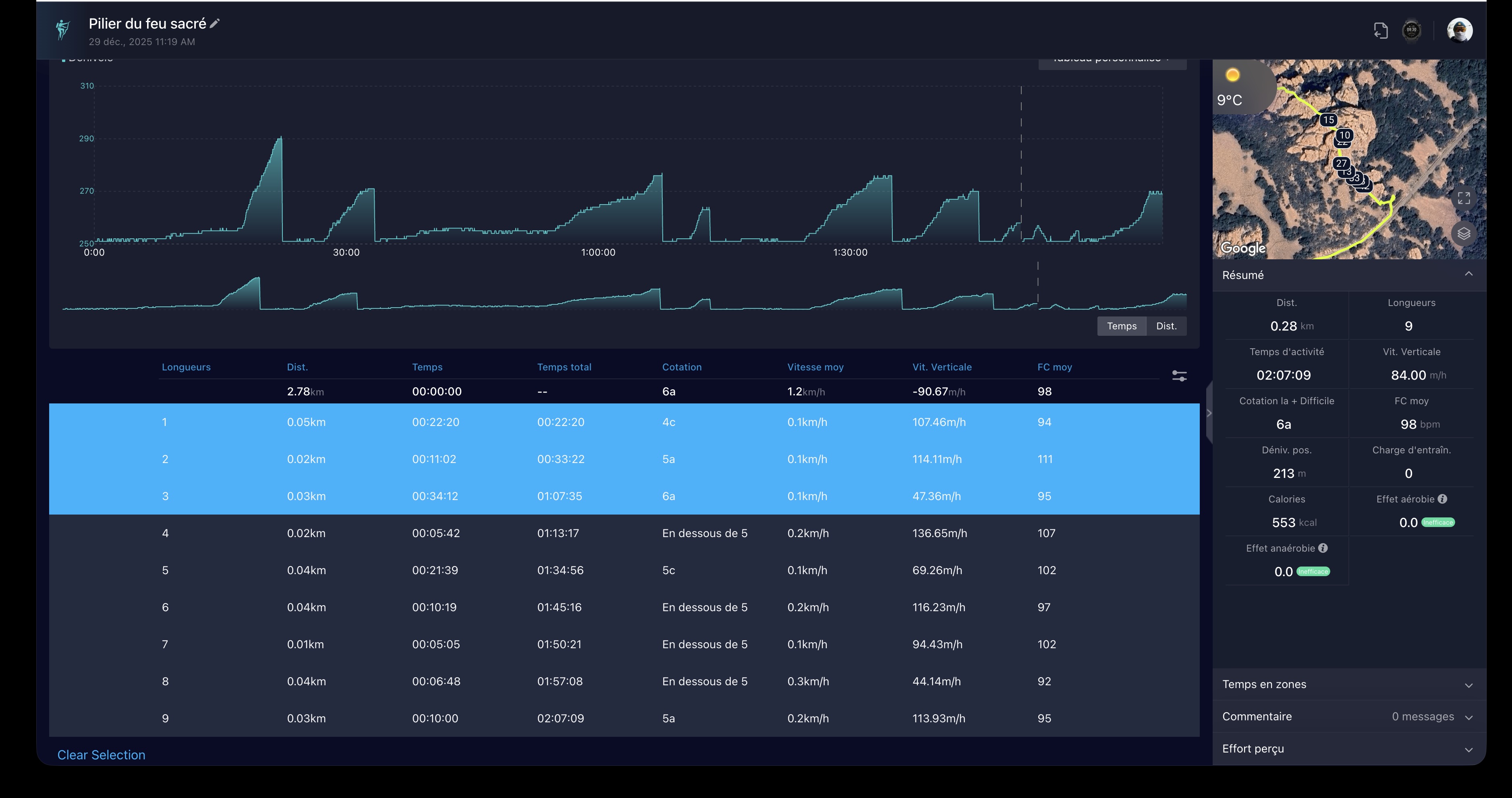 Pour l’escalade, c’est un véritable plaisir. Toutes les infos sur les sorties sont présentes et exploitables séparément, longueur par longueur pour les grandes voies. Tout ça vient du fait que la saisie sur la montre est parfaite et, contrairement à pas mal de montres de sport, comprend les besoins de la discipline.