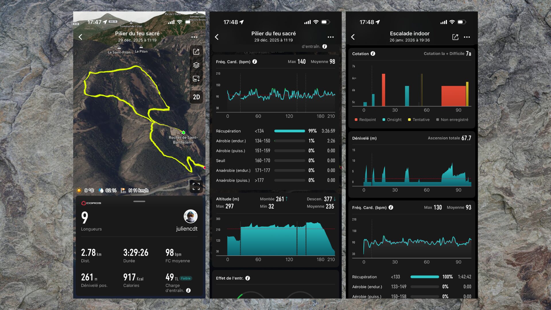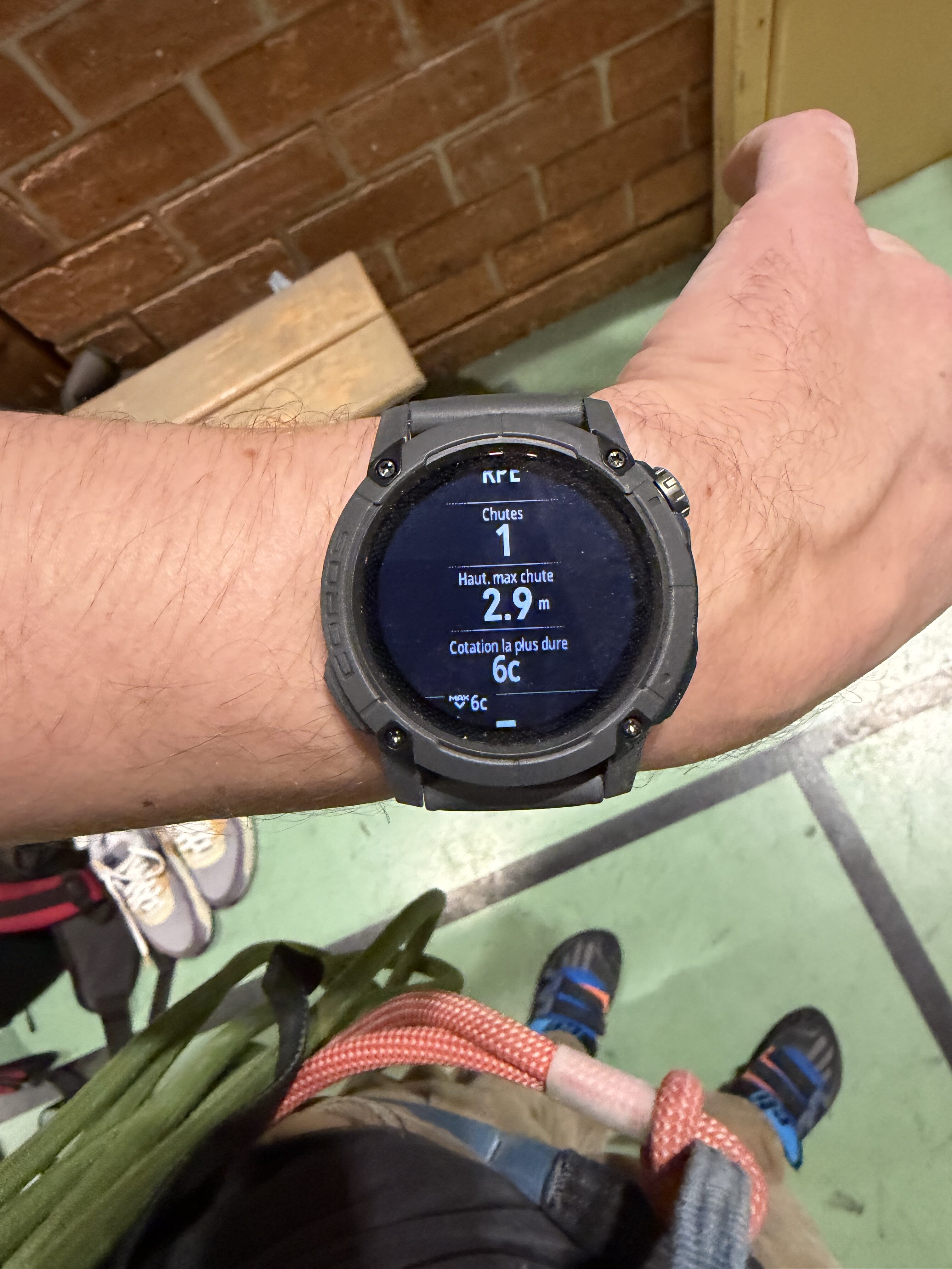 Côté voie d’une longueur (couenne), en extérieur comme en intérieur, le logiciel Coros est parfait. Il se déclenche seul aux premiers mouvements et passe en mode repos à la fin de la descente. En gros, vous le lancez une fois, vous entrez la cotation à chaque fin de voie et le reste est fait tout seul. On est sur un bon mix entre « lancer la montre et tout oublier » et « entrer les données précises qui ne peuvent être que manuelles au bon moment ». Attention en revanche à ne pas lancer votre séance à mi-parcours en mode « merde j’ai oublié » : la montre va estimer qu’il s’agit du point 0 et fausser tous les dénivelés / retours au sol. À ce sujet, l’accéléromètre est capable de savoir combien de fois vous chutez. Un peu inutile, mais rigolo.
