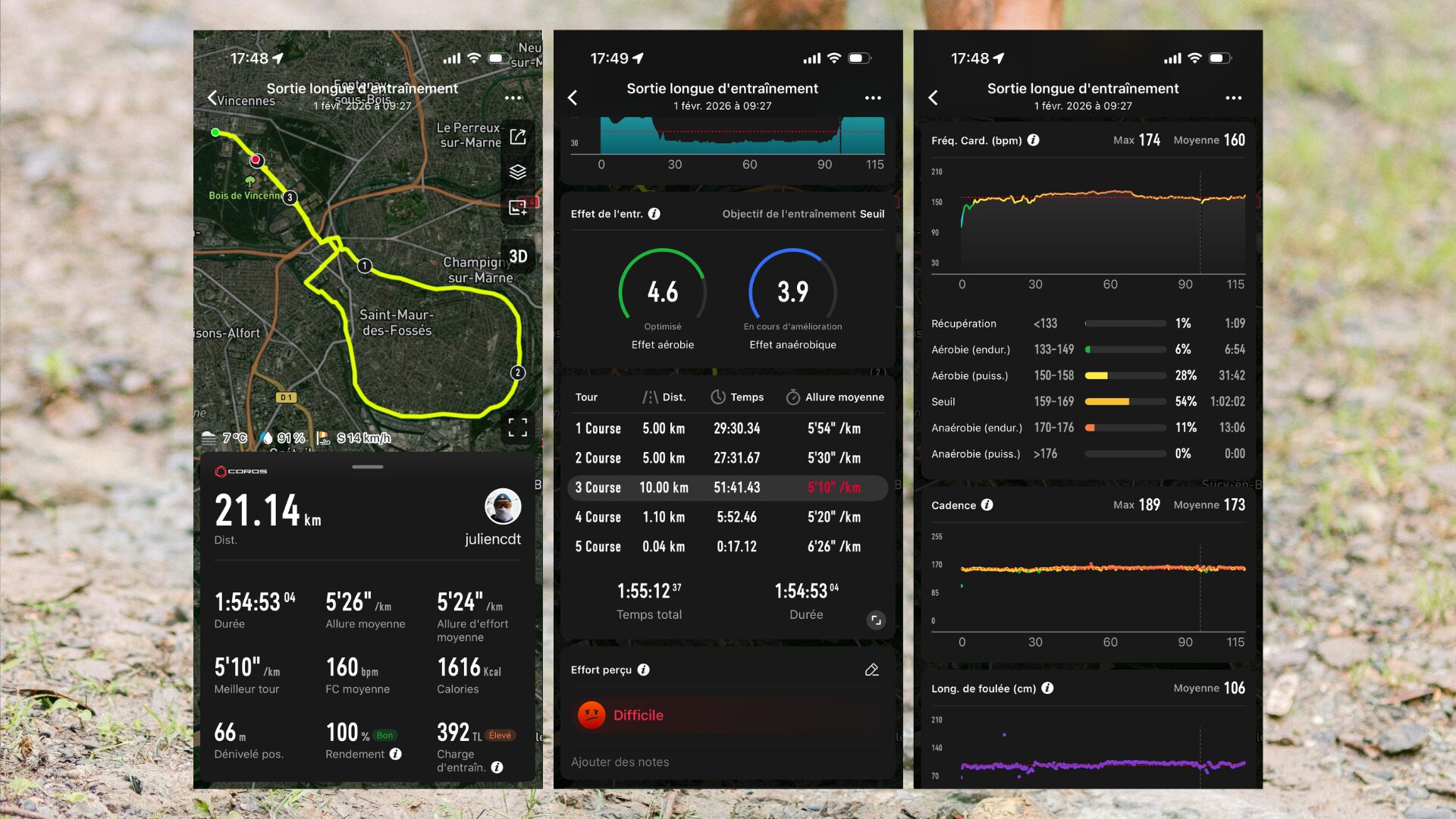 La Coros Nomad est aussi une excellente montre de sport, avec une autonomie dingue (je crois l’avoir chargée 3 fois max depuis que je la porte). Je l’ai testée à vélo en transport régulier, en randonnée avec mon fils sur le dos et en course pour la préparation du semi-marathon que je fais avec Runna. Pour ces trois activités, rien à dire : c’est une montre de sport ultra précise et fiable. En randonnée, j’ai adoré avoir la carte topographique précise directement sur le poignet, pour savoir combien il restait de D+ avant le sommet. En course, ce n’est peut-être pas aussi typé que Garmin, mais elle fait tout — et tout très bien. J’ai comparé la vitesse en temps réel avec la Watch Ultra et les deux matchent parfaitement — l’accroche GPS est rapide et efficace et les résumés sont excellents. Les données, toujours sur le training hub, sont nombreuses, précises et interprétables.