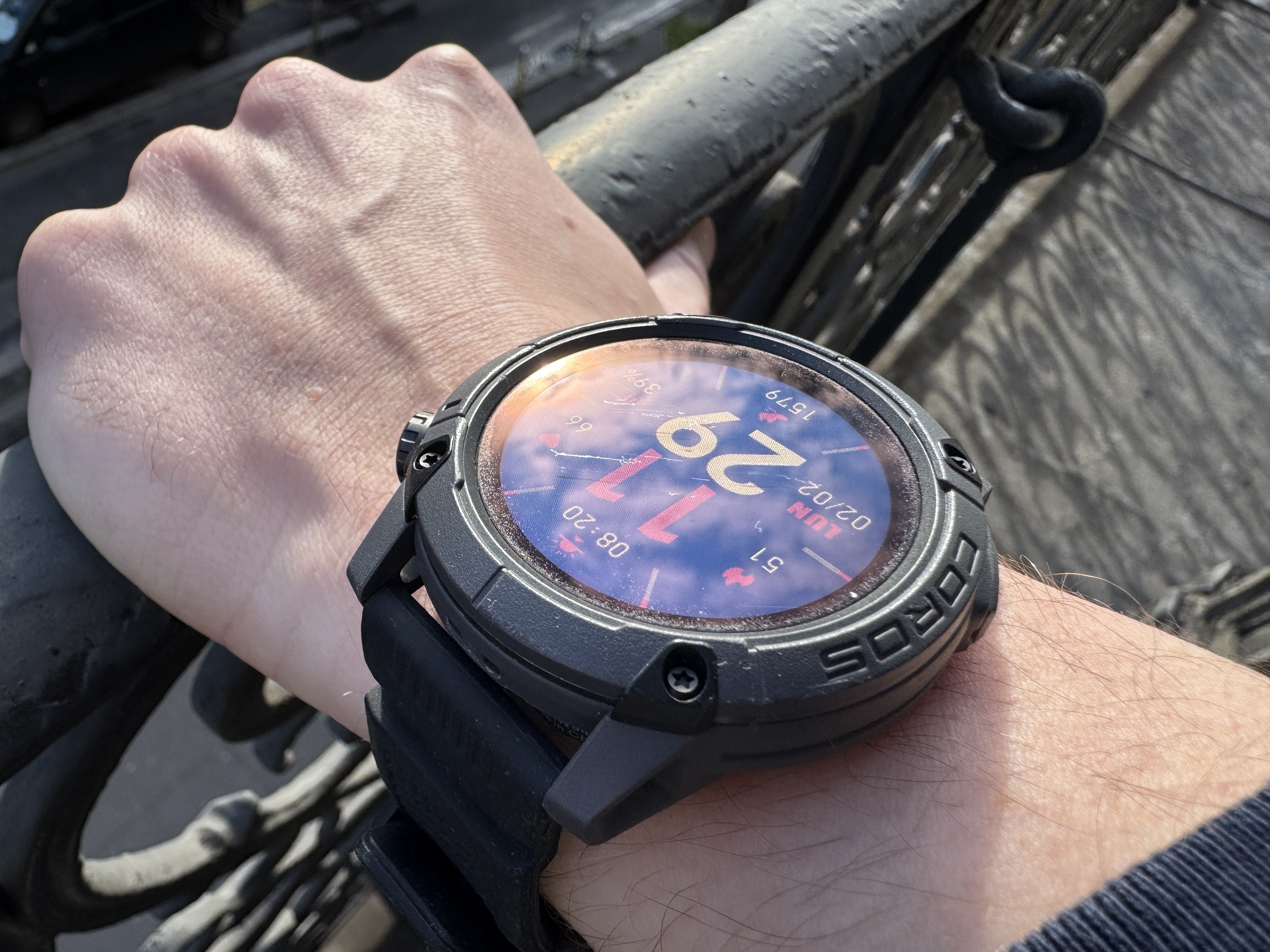 La Coros Nomad a un énorme problème pour l’escalade : le revêtement de son verre. En un an avec l’Apple Watch Ultra, protégée par du verre saphir, après l’avoir martyrisée, je n’ai eu aucune rayure visible. Le titane vieillit bien au contact du rocher ou des prises et l’écran est remarquablement résistant — les rayures ne se voient que sous un angle bien précis, que je n’arrive quasi jamais à atteindre. J’ai gratté la Coros Nomad une fois dans une voie en salle et elle a pris une trace indélébile et très visible sur son écran.