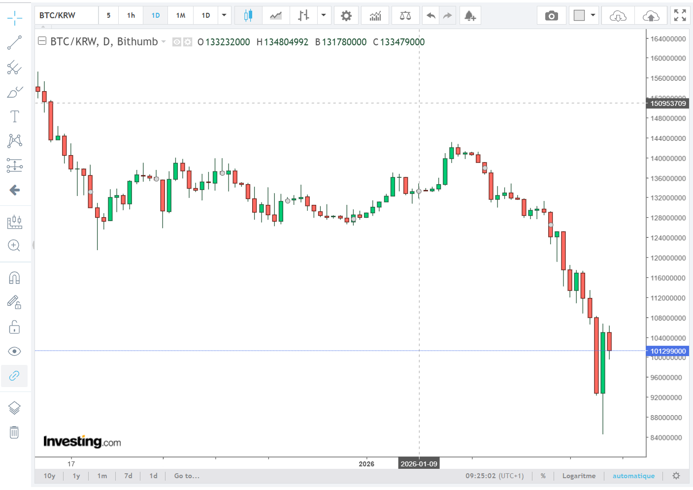 Et c’est précisément cette vague soudaine d’ordres de vente a provoqué un flash crash local sur la paire BTC/KRW. En quelques instants, le prix du Bitcoin a décroché de près de 16 % sur Bithumb, tombant bien en dessous des prix observés sur les autres plateformes internationales.
