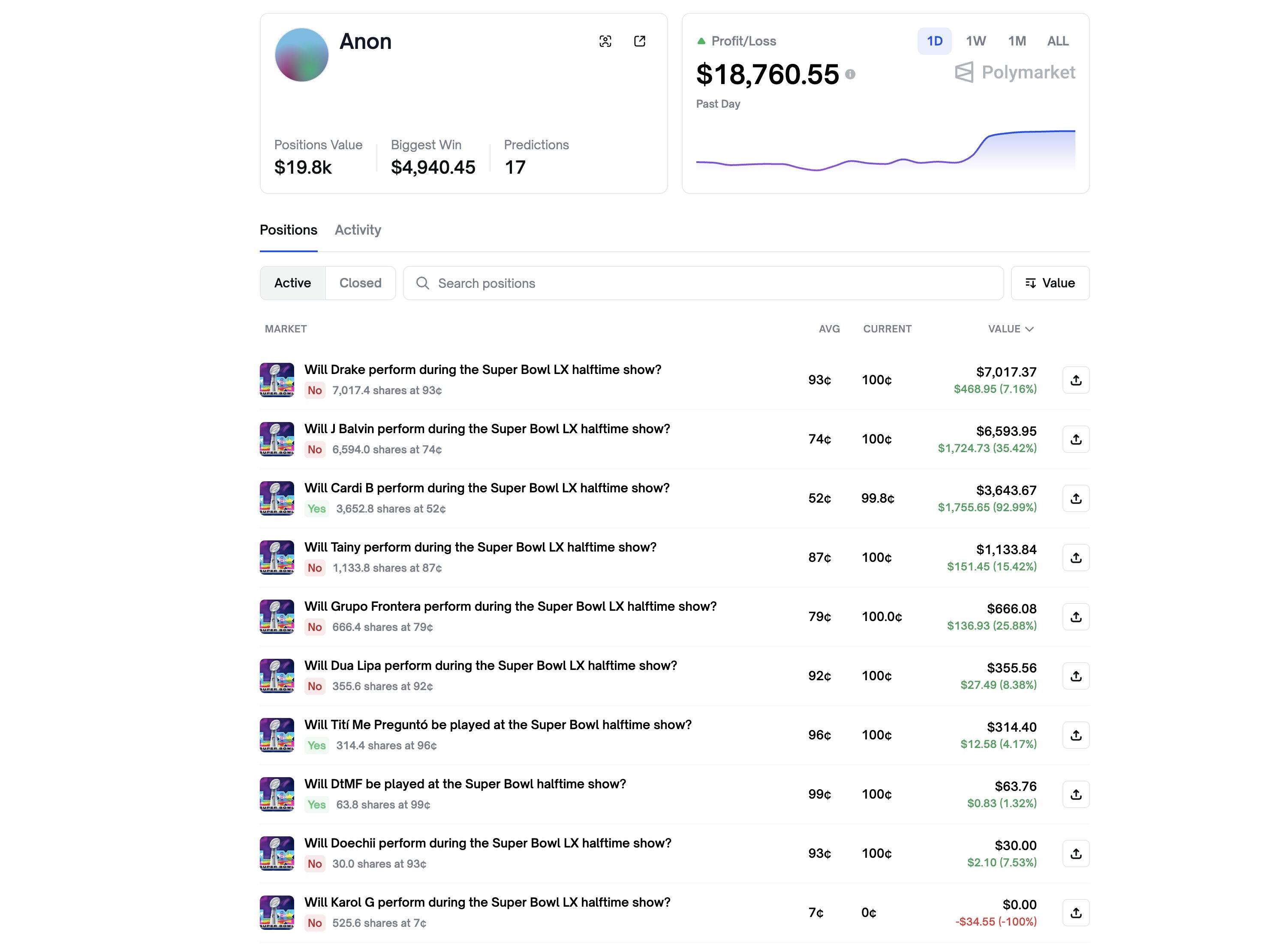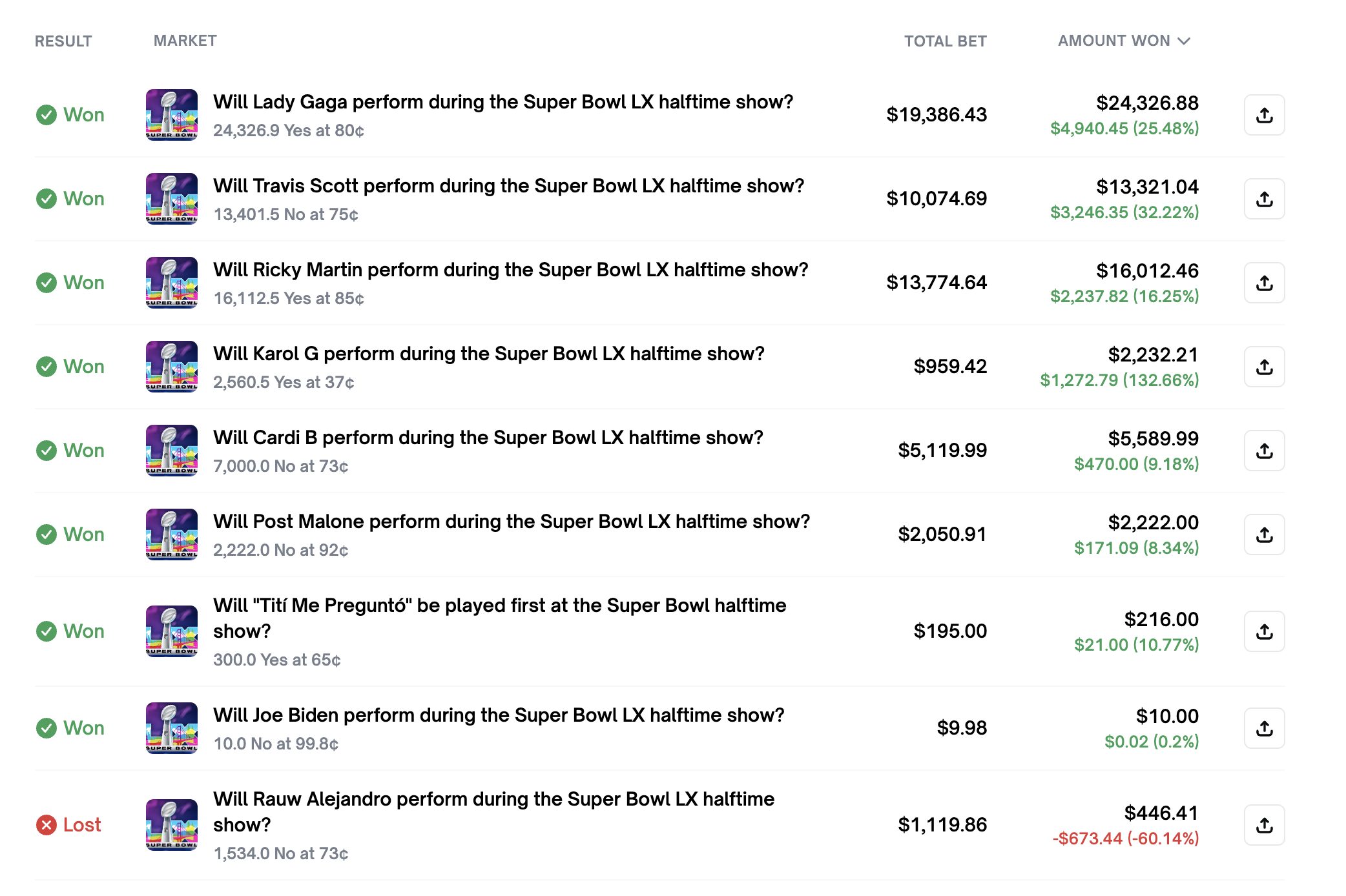 Deux jours avant le Super Bowl, le compte « Anon » a commencé à placer des petits paris sur l’identité des artistes qui accompagneront Bad Bunny. 259 dollars, puis 683 dollars, puis 1 423 dollars ou 541 dollars…. La méthode est bien connue : ne pas éveiller les soupçons en pariant d’un seul coup plusieurs dizaines de milliers de dollars. Il a donc pu passer inaperçu pendant plusieurs heures, jusqu’à ce que d’autres parieurs découvrent son profil et son impressionnant portfolio.