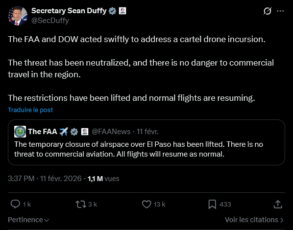 C’est ce qu’indiquait ainsi le secrétaire aux Transports des États-Unis, Sean Duffy : « La FAA et le Pentagone ont agi rapidement pour contrer une incursion de drones appartenant à un cartel. La menace a été neutralisée et le transport commercial dans la région n’est plus en danger. Les restrictions ont été levées et les vols normaux reprennent. »