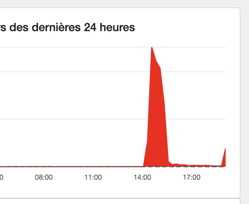 À en croire DownDetector, en France comme aux États-Unis, Twitter ne fonctionne plus chez personne. Il y a eu 12 000 signalements en 20 minutes aux États-Unis et 1500 en France. Tout Twitter semble perturbé.