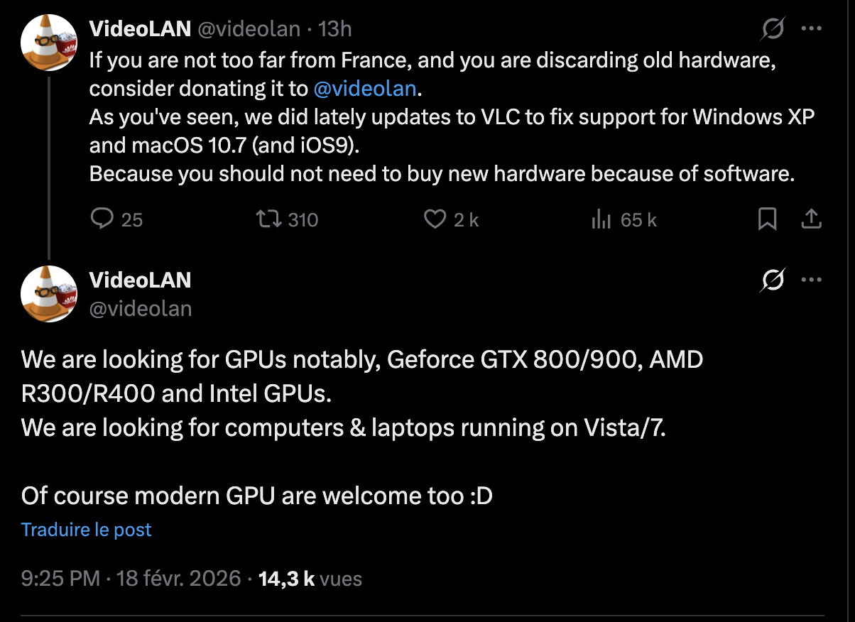 Sur X, ils ont passé le 18 février 2026 un appel aux dons. Les créateurs du projet open source installé des milliards de fois font un constat : la plupart des logiciels modernes exigent Windows 10 ou 11 pour tourner correctement (ou le dernier macOS), mais eux continuent de maintenir la compatibilité de VLC avec les anciens OS comme Windows XP ou macOS 10.7 (Lion). Pour garantir que les dernières mises à jour ne cassent rien sur ces systèmes d’exploitation d’un autre temps, ils ont besoin de matériel ancien pour effectuer des tests de compatibilité.