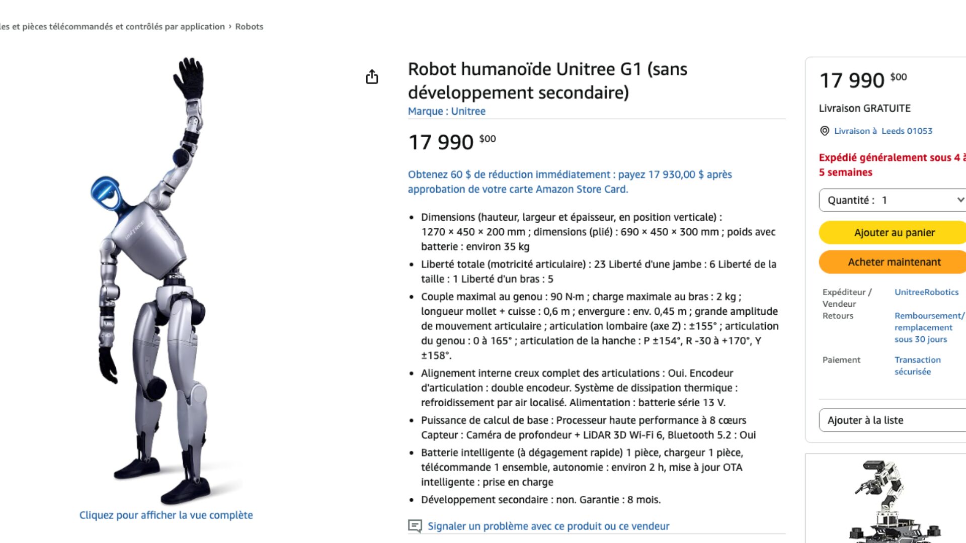 En passant par Amazon.com — avec un code postal américain — nous avons tout de même pu ajouter le G1 au panier, avec un délai d’expédition annoncé entre quatre et cinq semaines. À noter toutefois qu’il s’agit d’une version « sans développement secondaire » : autrement dit, pas de kit de développement logiciel (SDK) ni d’accès bas niveau pour programmer le robot.