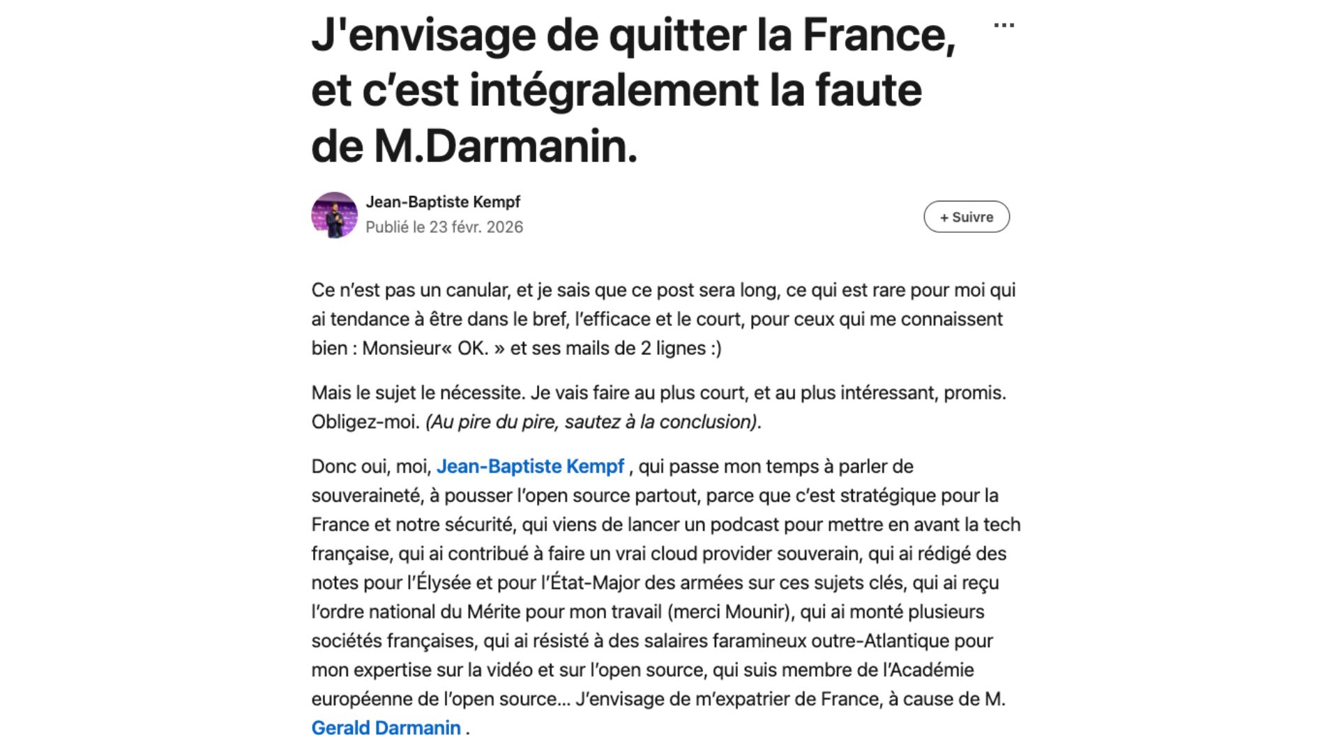 Dans un message publié sur LinkedIn le 22 février 2026, l’ingénieur ne cache pas son amertume : « J’envisage de quitter la France, et c’est intégralement la faute de M. Gérald Darmanin », écrit-il dans une longue prise de parole. Une décision qui est directement liée à la situation de sa femme.