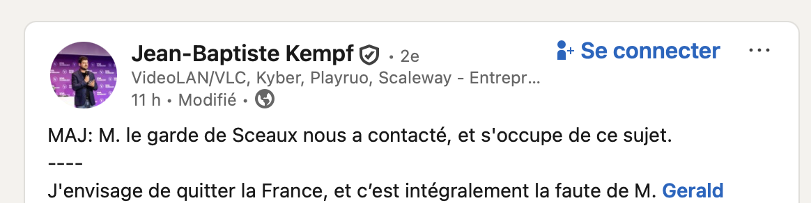 Ironie finale : dans le même message, le Garde des Sceaux rappelle que la publication effectuée via le compte X de VideoLAN — depuis supprimée — et qui encourageait vraisemblablement à interpeller le ministère, pourrait constituer un délit si des faits de harcèlement étaient caractérisés. Jean-Baptiste Kempf a depuis mis à jour son message et supprimé le tweet problématique.