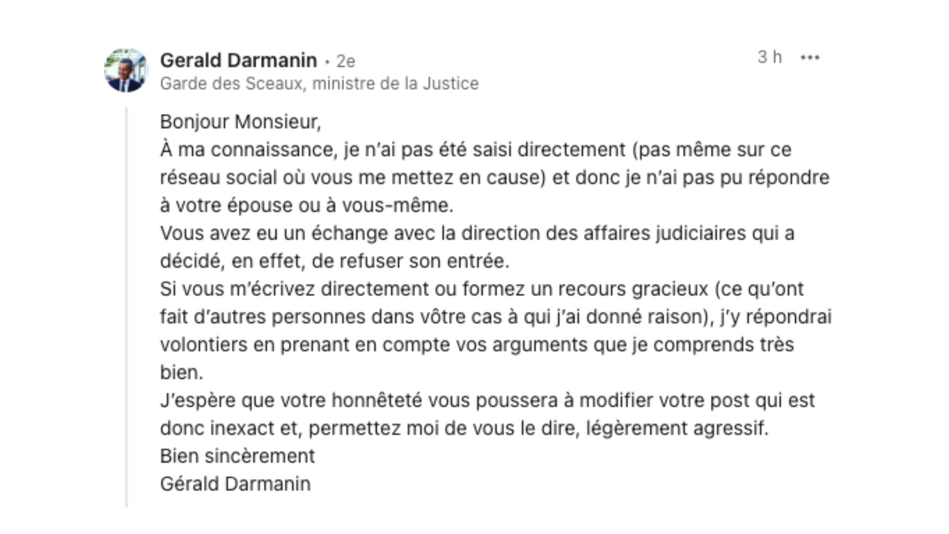 Le ministre de la Justice Gérald Darmanin a finalement répondu à Jean-Baptiste Kempf, directement dans les commentaires de sa publication LinkedIn. « À ma connaissance, je n’ai pas été saisi directement (pas même sur ce réseau social où vous me mettez en cause) et donc je n’ai pas pu répondre à votre épouse ou à vous-même », assure d’abord le Garde des Sceaux.