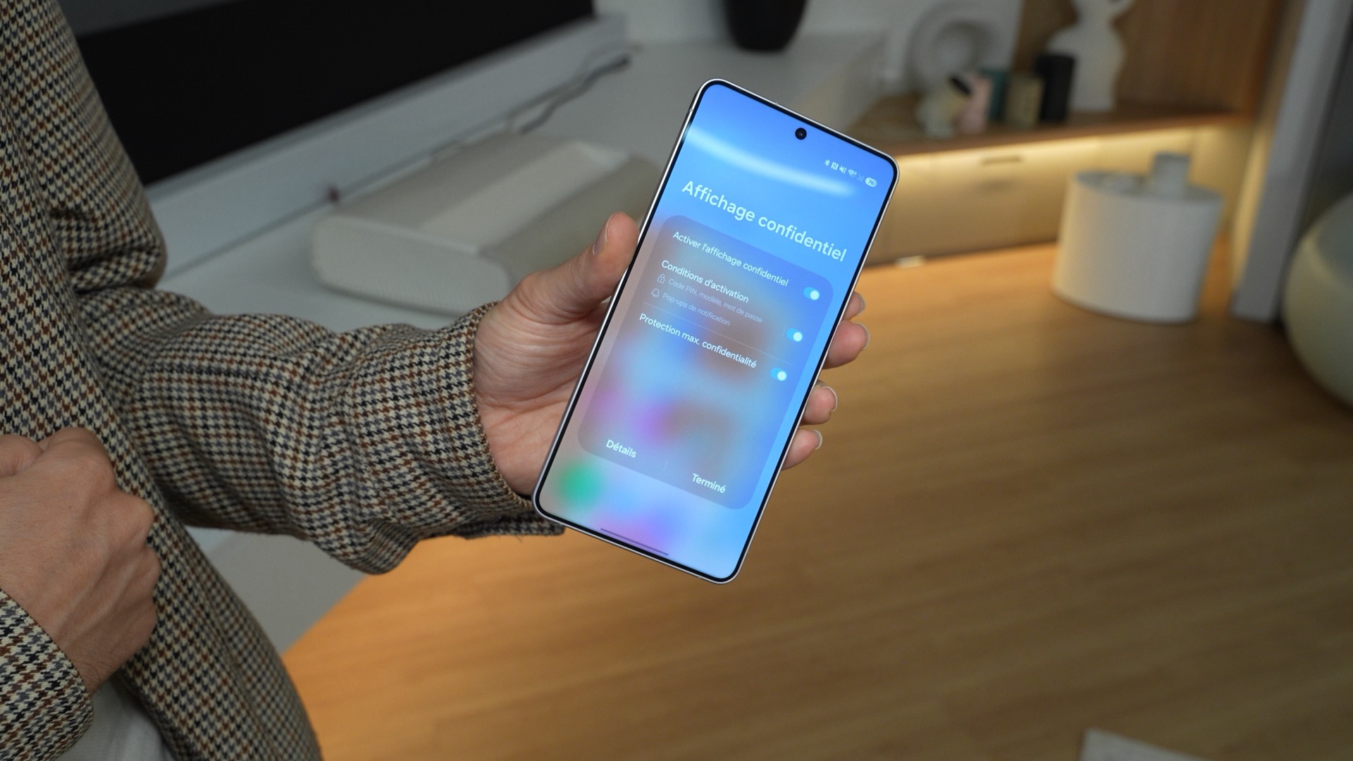 Ce que propose le S26 Ultra n’est pas un filtre par-dessus l’écran, mais un filtre intégré à l’écran et désactivable sur commande. On active le Privacy Display manuellement depuis les réglages ou le centre de contrôle, avec deux paramètres différents (moyenne ou haute confidentialité). Un film qui se colle perturbe forcément l’affichage des couleurs et la luminosité : la technologie de Samsung ne le fait pas. Autre avantage de la technologie de Samsung : la lumière est aussi bloquée depuis le haut ou le dessous de l’écran, pas seulement sur le côté.