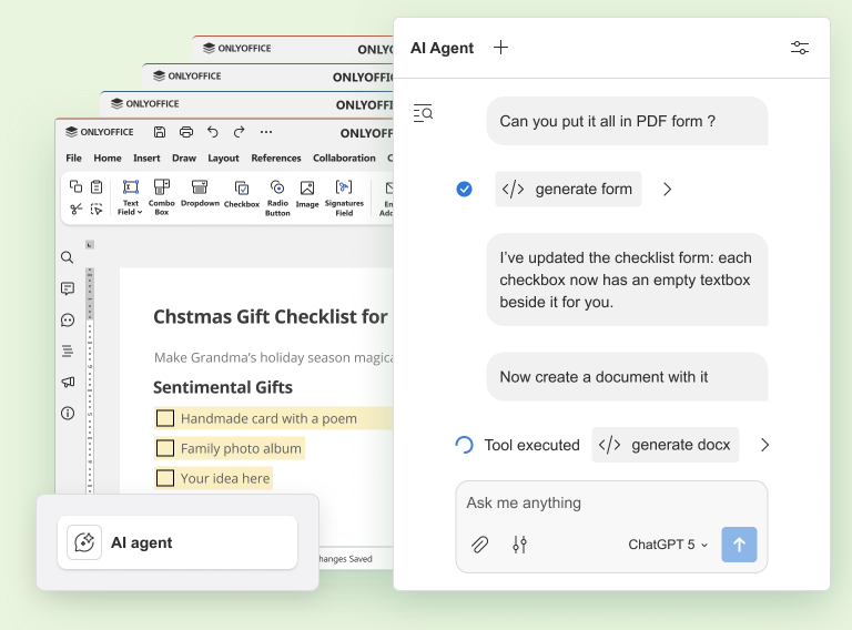 Compatible avec les principaux fournisseurs (ChatGPT, Gemini, etc.), ONLYOFFICE vous permet de rédiger des prompts et de les enregistrer pour y faire appel sur d’autres documents, en un clic.