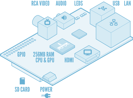 Que contient justement le Raspberry Pi ? On y trouve un processeur ARM 11 cadencé à 700 MHz et d’un processeur graphique Videocore 4 capable de diffuser des vidéos en haute définition (1080p), 256 MB de mémoire vive et une connectique variée : HDMI, USB 2.0, Ethernet, prise RCA, un support pour les cartes SD, une prise jack.