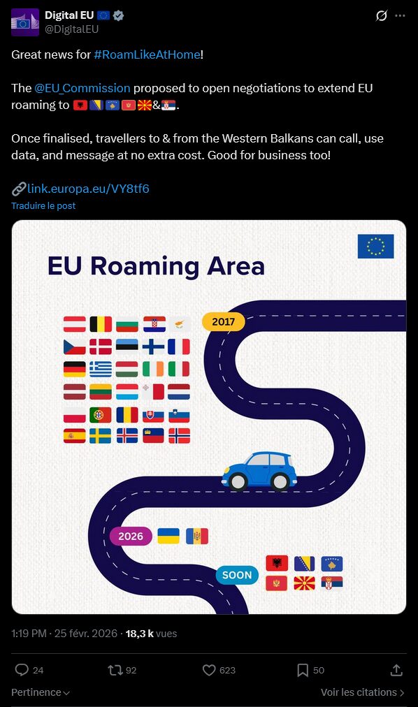Mais le périmètre de cette aire doit bouger : une première extension est prévue courant 2026, avec l’inclusion de la Moldavie, pays enclavé entre la Roumanie et l’Ukraine, puis avec l’Ukraine, puis « prochainement » pour les six pays balkaniques précédemment mentionnés. D’autres pays pourraient ensuite être ajoutés, comme le Royaume-Uni et la Turquie (le Royaume-Uni est souvent inclus par les opérateurs français, mais le Brexit lui a fait quitter la zone roaming).