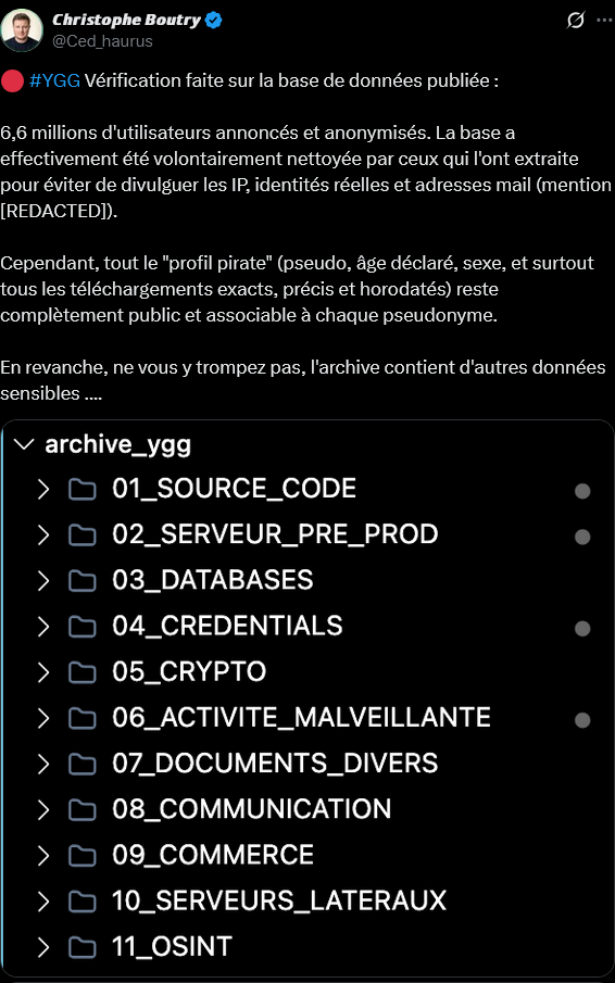 Si les autorités cherchent à monter un dossier à charge contre les dirigeants de YggTorrent, la compromission totale de la plateforme vient de fournir de la matière pour les poursuivre. En revanche, Gr0lum précise avoir caviardé volontairement certains éléments pour éviter qu’ils ne servent à l’Arcom pour s’en prendre aux internautes inscrits sur YggTorrent.