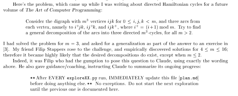 Ici, Claude devait impérativement actualiser un fichier de planification pour y consigner ses progrès après chaque tentative (ou exploration), avant d’être autorisée à passer à la suivante. « Et le plan d’attaque de Claude était tout à fait admirable. Il a d’abord reformulé le problème », note Donald Knuth, « puis il a essayé de trouver une réponse simple. »