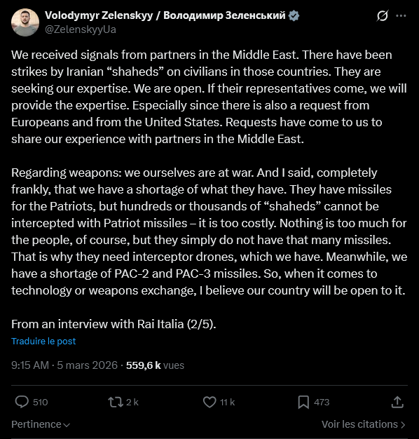 « Nous avons reçu des signaux de la part de partenaires au Moyen-Orient. Il y a eu des frappes de Shahed iraniens contre des civils dans ces pays », écrit le chef d’État sur son compte X, reprenant des propos tenus lors d’une interview pour la chaîne de TV italienne Rai Italia. Il citait alors les Émirats arabes unis, le Qatar, Bahreïn, la Jordanie et le Koweït.