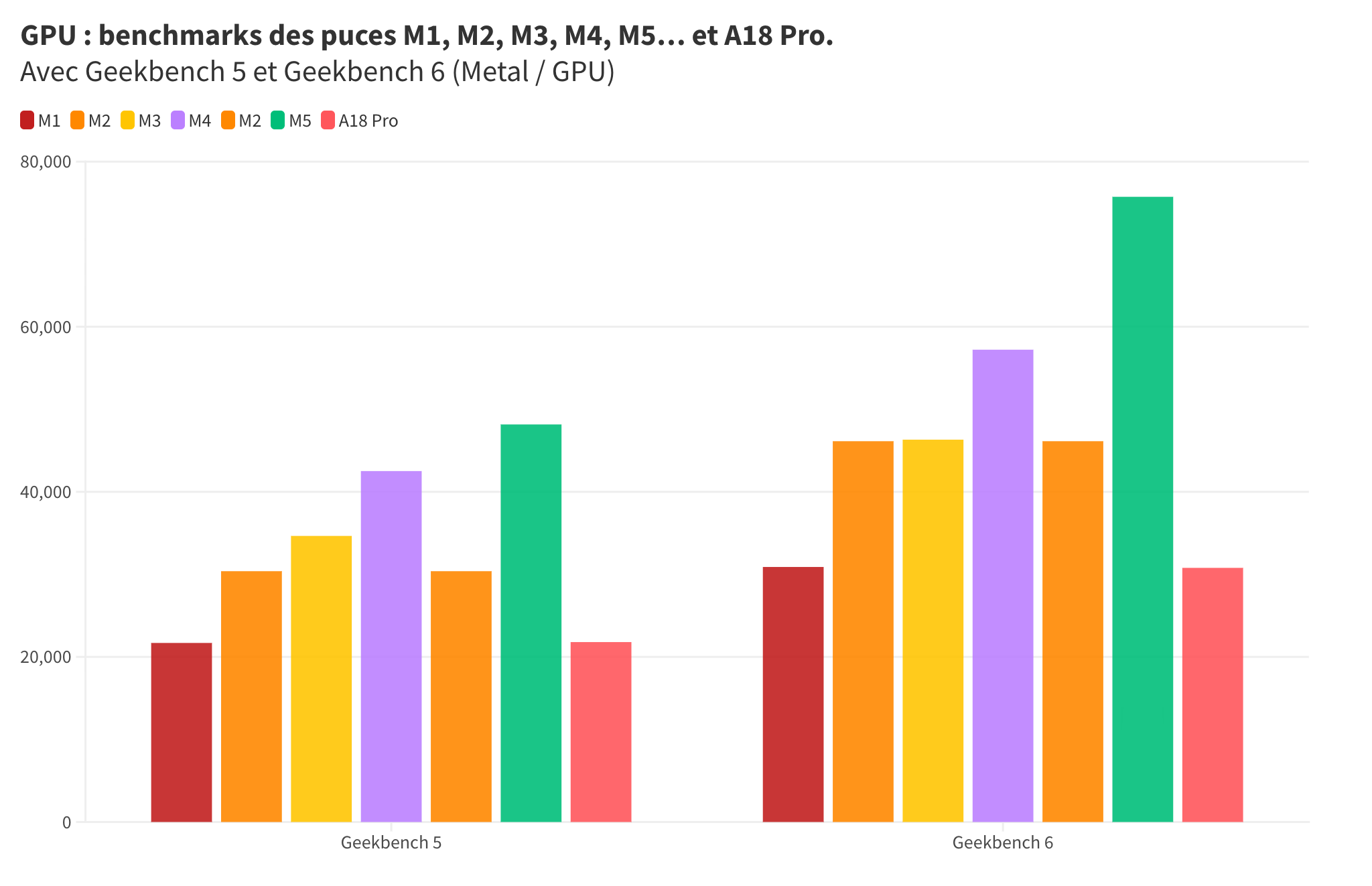 Enfin, nos tests montrent que les performances graphiques du MacBook Neo (GPU) sont équivalentes à celles d’un MacBook Pro M1 de 2020. C’est assez pour les usages du quotidien, mais forcément un élément à prendre en compte si l’on fait des études d’audiovisuel ou de jeux vidéo : il vaut mieux prendre un Mac avec une puce M4 ou M5.