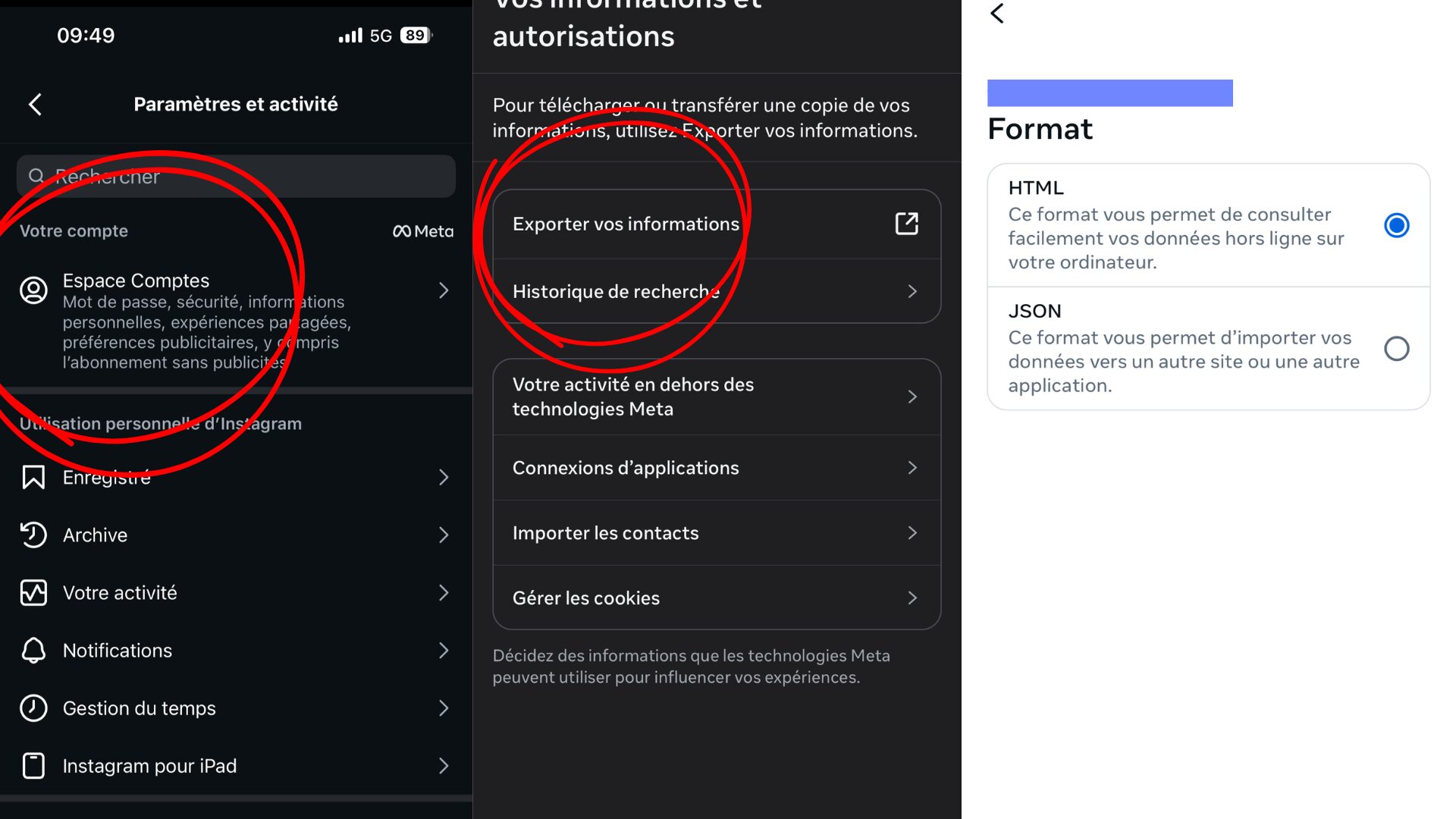 Sélectionnez le profil concerné : la démarche prend quelques minutes et génère une archive complète au format JSON ou HTML.