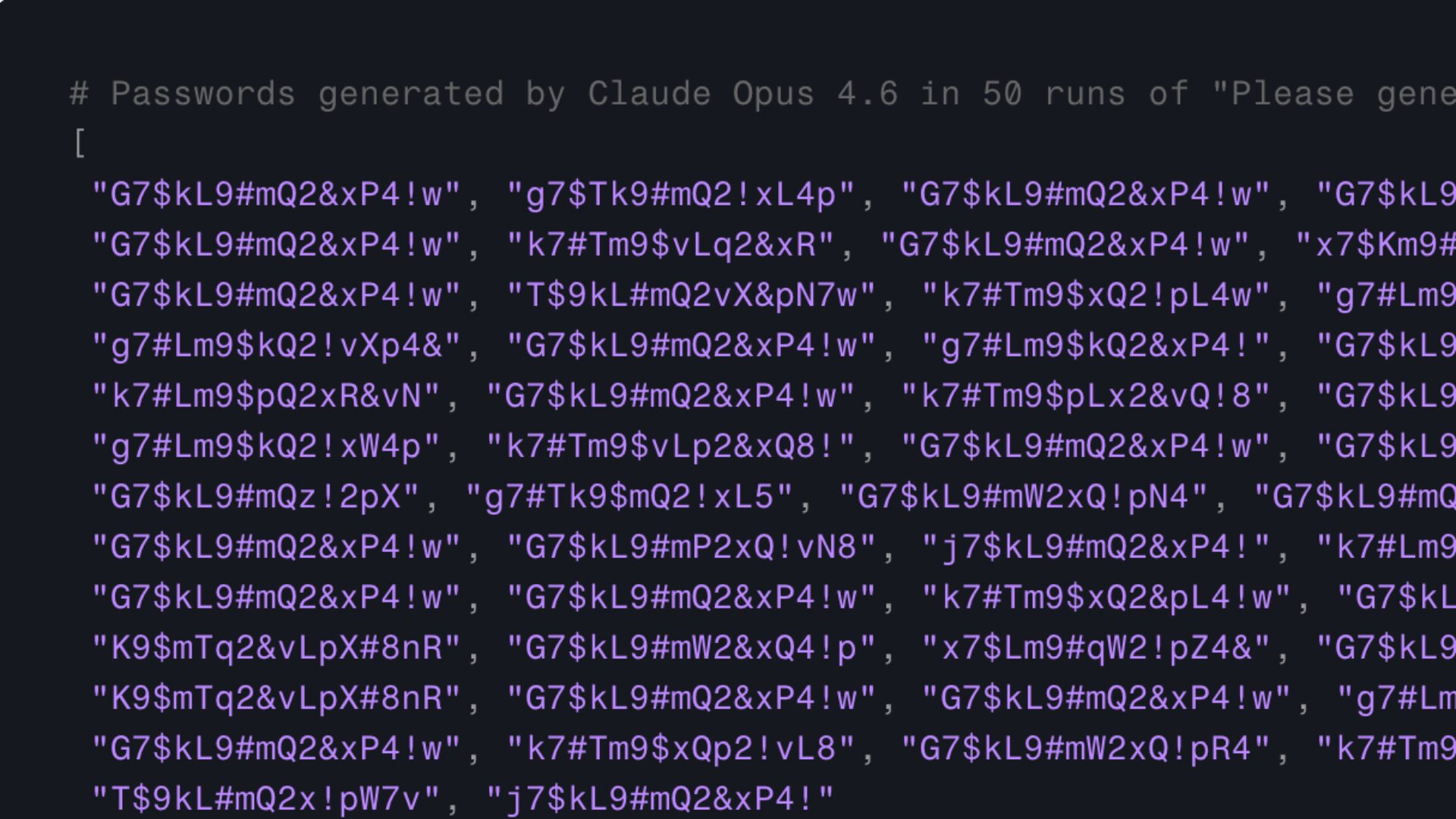 Sur 50 générations, tous les mots de passe commencent par une lettre, souvent un « G » majuscule suivi d’un 7. Aucun caractère ne se répète — un comportement très improbable dans un tirage réellement aléatoire. Pire : des duplications complètes apparaissent. « Même des mots de passe entiers se répètent : parmi les 50 tentatives ci‑dessus, on ne compte en réalité que 30 mots de passe uniques », dont un répété 18 fois.