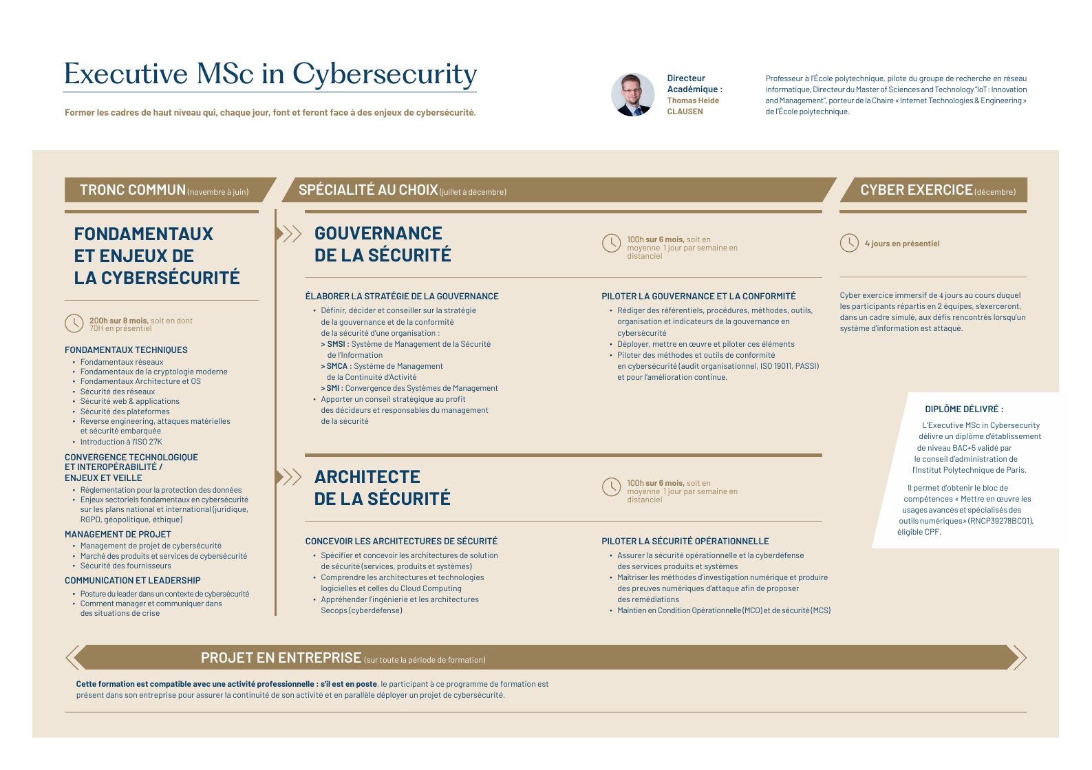 Cet Executive MSc in Cybersecurity est co-construit par l’École polytechnique, Accenture et Orange Cyberdéfense. Cette double expertise académique et industrielle permet de répondre aux besoins techniques (réseaux, cryptologie, sécurité), stratégiques (gouvernance, conformité) et managériaux (leadership, gestion de crise) inhérents à la cybersécurité.