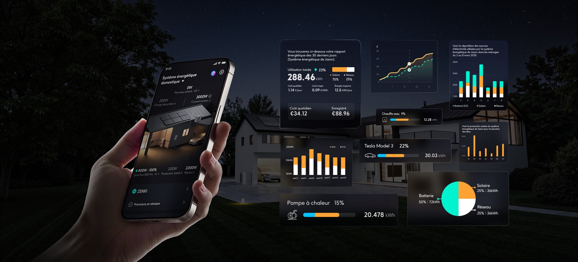 Alimenté par l’intelligence artificielle, ZENKI 2.0 croise en temps réel plusieurs paramètres comme le coût de l’énergie, l’ensoleillement ou vos habitudes de consommation. Grâce à ces informations, ZENKI 2.0 est alors apte à déterminer si l’énergie produite doit être utilisée pour alimenter les batteries ou les appareils branchés dans le foyer pour réaliser le maximum d’économies.