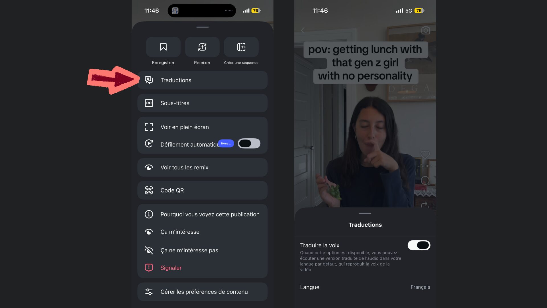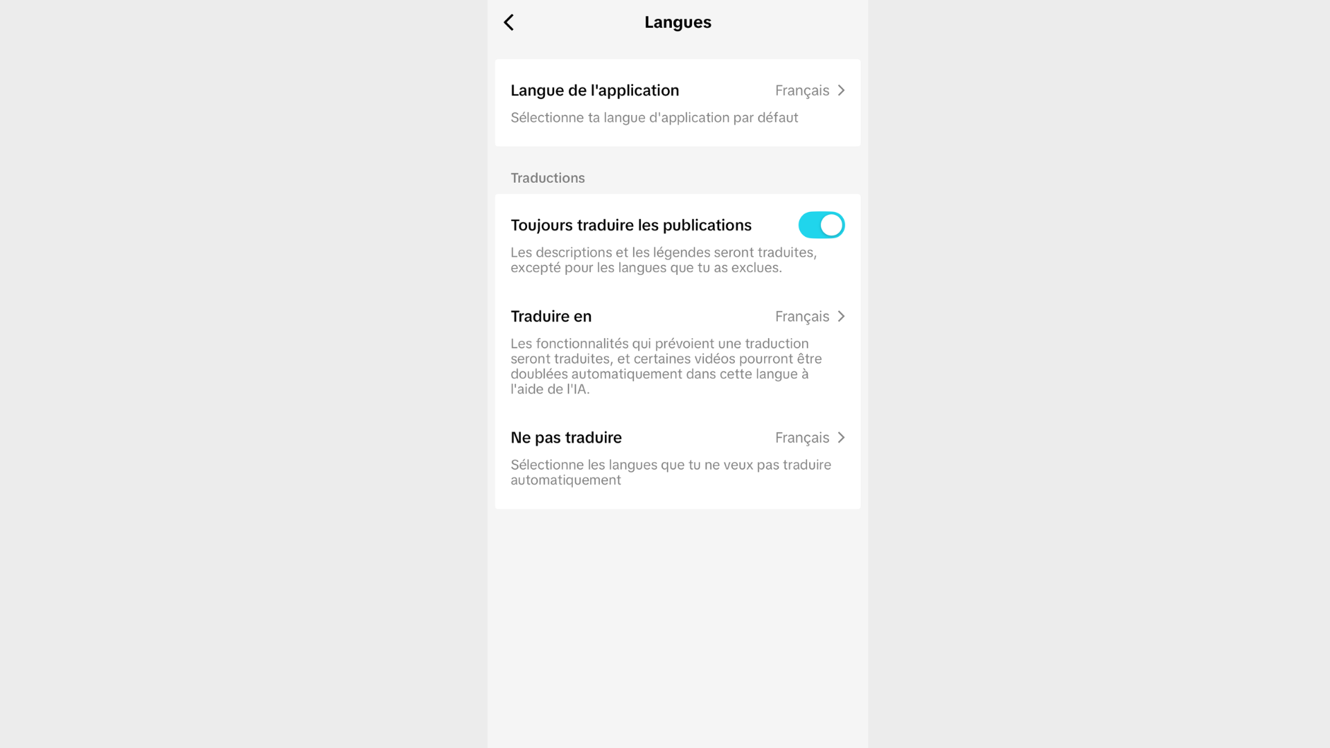 Sur TikTok, l’application traduit automatiquement une partie des légendes et commentaires en fonction de la langue de l’interface. Les options sont situées dans « Paramètres et confidentialité », puis « Langue » ou « Préférences de contenu ». Vous aurez alors une case « Toujours traduire les publications » — ainsi que la possibilité de sélectionner des langues que vous ne souhaitez pas voir traduites.