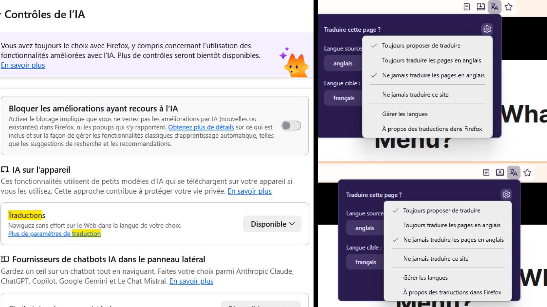 Selon les versions de Firefox, un menu lié au « contrôle de l’IA » peut également apparaître : il permet de gérer ou désactiver certaines fonctions de traduction automatique dans les paramètres du navigateur.