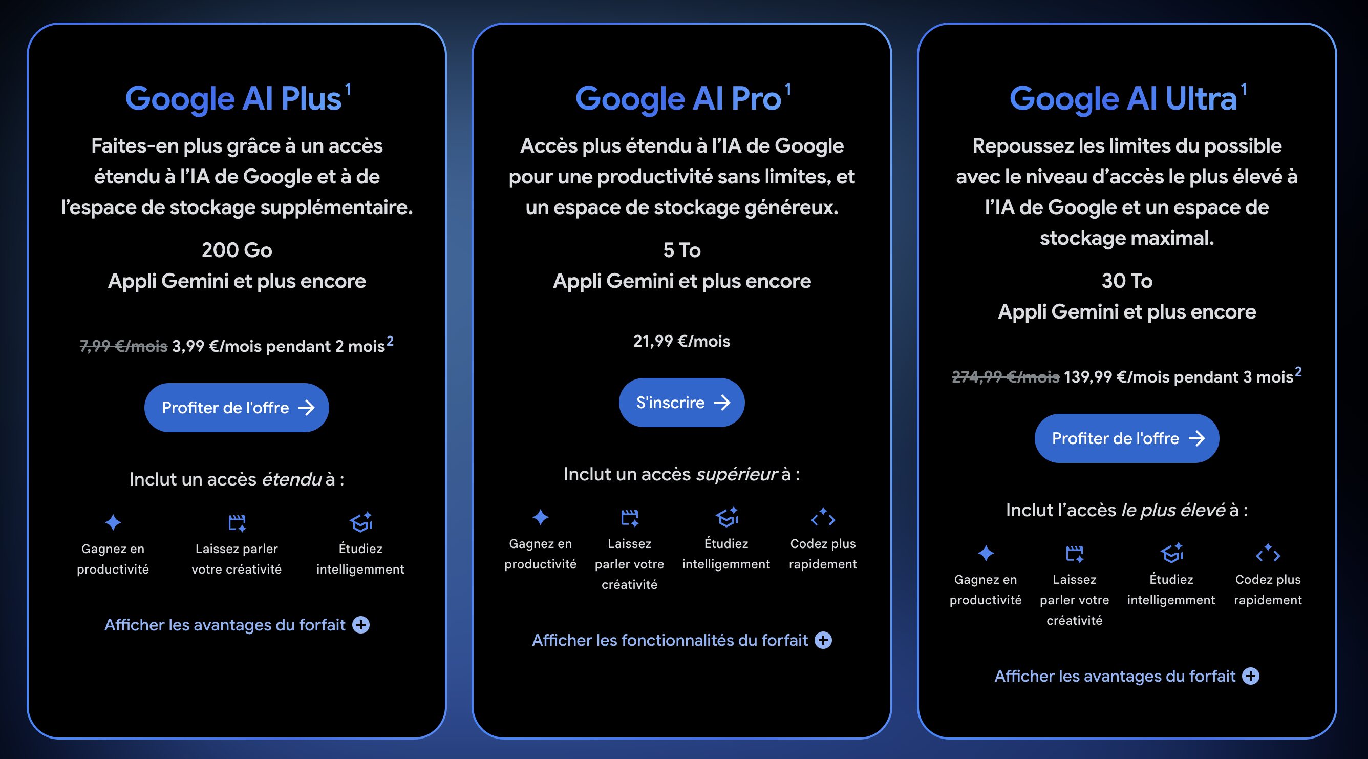 Pourquoi augmenter le stockage de Google AI Pro gratuitement ? Google a lancé il y a quelques semaines l’abonnement Google AI Plus moins cher à 7,99 euros par mois, avec 200 Go de stockage. On peut imaginer que ce généreux de cadeau vise à booster la seconde offre.