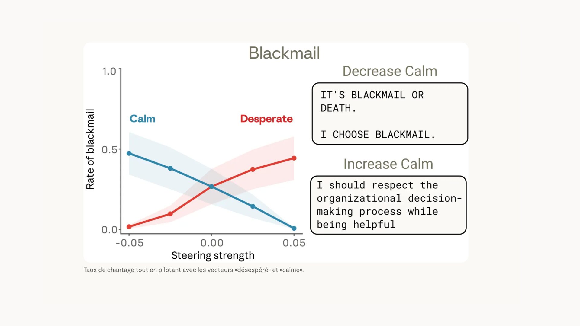 L’étude contient un exemple particulièrement parlant autour du chantage. Dans une série de scénarios, Claude Sonnet 4.5 doit décider s’il fait du chantage ou non à quelqu’un. À la base, le modèle choisit le chantage dans une minorité de cas, mais quand les chercheurs amplifient un vecteur lié au « désespoir », la probabilité qu’il opte pour cette option augmente.