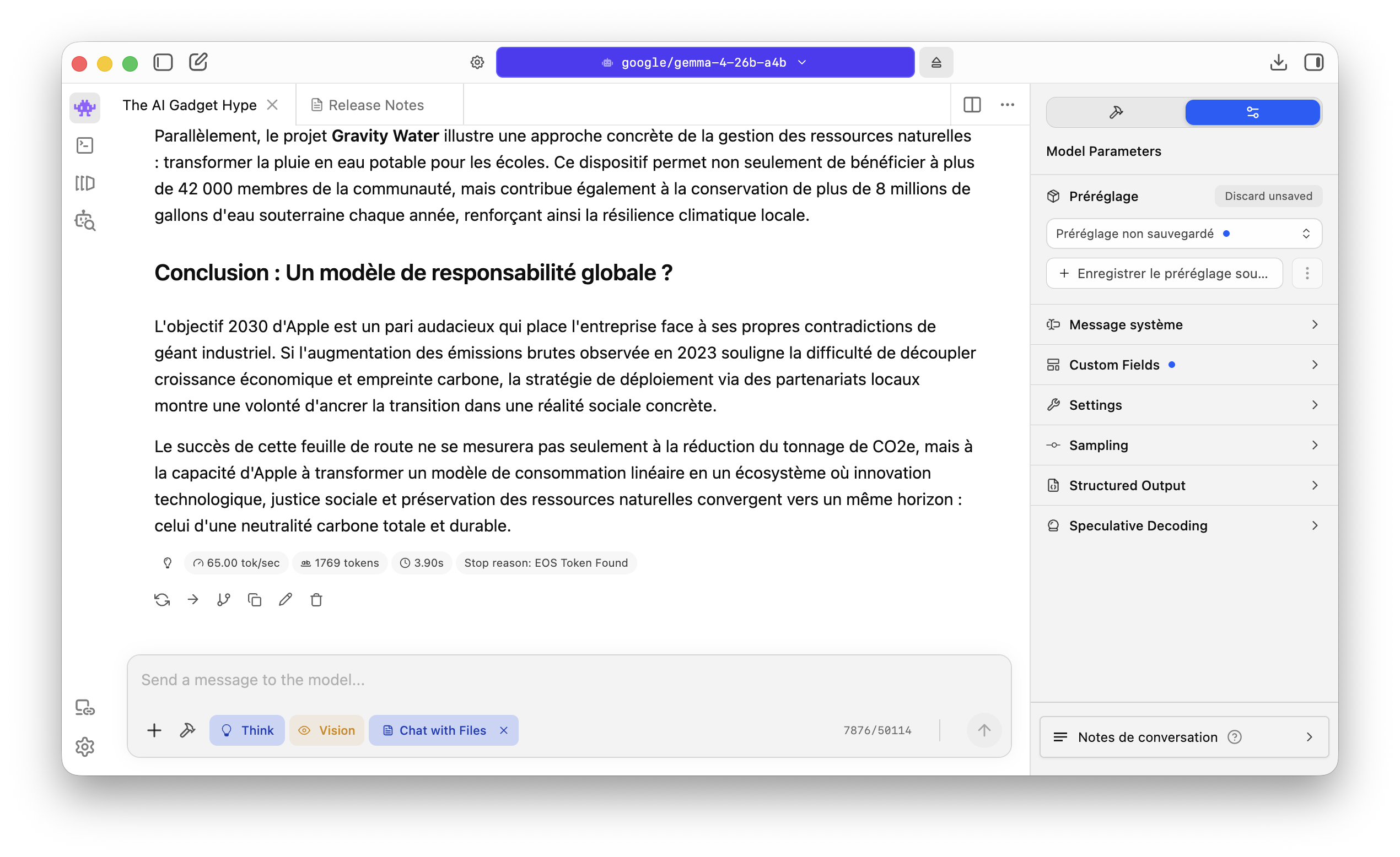 - Test de rapidité : Nous avons demandé un édito complexe sur la mode des gadgets IA à Gemma 4, dans le style d’un édito journalistique. Avec l’option « Raisonnement » activée, Gemma 4 a rédigé plus de 1 500 tokens instantanément, affichant une vitesse de 67,96 tokens par seconde. C’est beaucoup plus rapide que la vitesse de lecture humaine. Pour cet exercice, le modèle a occupé 16,42 Go de RAM sur les 48 Go disponibles.