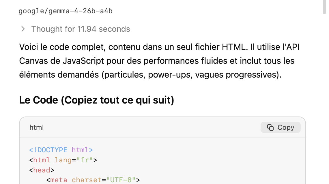 - Test de code : Pour aller plus loin, nous avons fait sauter la limite de tokens autorisés par réponse. L’objectif ? Faire coder à Gemma un jeu d’arcade type Space Invaders complet en HTML/JS, avec système de particules, gestion des vagues et des scores, dans un seul fichier très dense. Le modèle y est parvenu en environ 2 minutes, avec les ventilateurs actifs, mais pas au maximum.