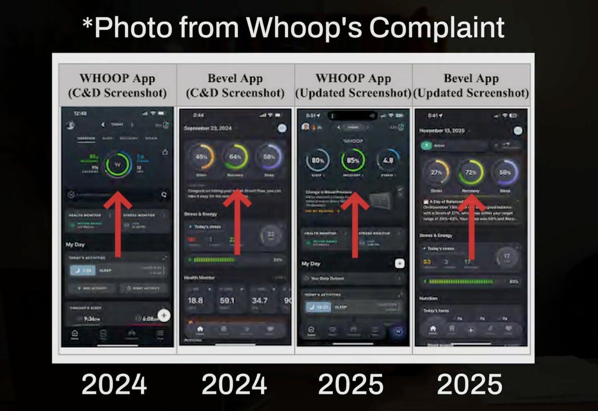 Dans sa plainte de 111 pages déposée dans le Delaware, Whoop demande à Bevel de désactiver son mode sombre et de cesser d’utiliser des termes courants comme « Strain » (Effort) et « Recovery » (Récupération). L’entreprise suggère que Bevel l’a copié pour élargir son application à l’Apple Watch et aux montres Garmin.