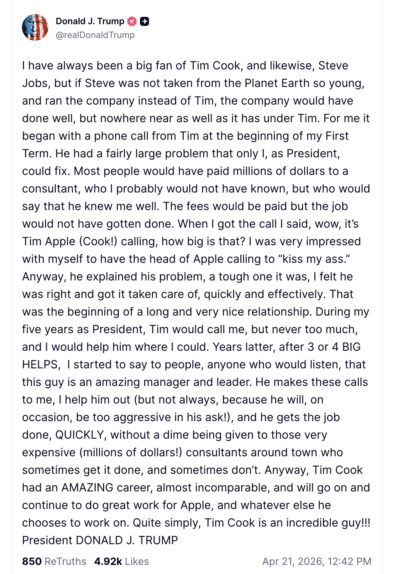 « J’ai toujours été un grand fan de Tim Cook, et de même, de Steve Jobs, mais si Steve n’avait pas été retiré de la Planète Terre si jeune, et dirigeait l’entreprise au lieu de Tim, l’entreprise aurait bien marché, mais pas du tout aussi bien que sous Tim. Pour moi, ça a commencé par un coup de fil de Tim au début de mon Premier Mandat. Il avait un assez gros problème que seul moi, en tant que Président, pouvais régler. La plupart des gens auraient payé des millions de dollars à un consultant, que je n’aurais probablement pas connu, mais qui dirait qu’il me connaissait bien. Les frais auraient été payés mais le boulot n’aurait pas été fait. Quand j’ai eu l’appel, j’ai dit, wow, c’est Tim Apple (Cook !) qui appelle, à quel point c’est énorme ? J’étais très impressionné par moi-même d’avoir le patron d’Apple qui m’appelle pour me « lécher le cul ». Bref, il a expliqué son problème, et c’en était un difficile, j’ai senti qu’il avait raison et je m’en suis occupé, rapidement et efficacement. C’était le début d’une longue et très belle relation. Pendant mes cinq années en tant que Président, Tim m’appelait, mais jamais trop, et je l’aidais là où je pouvais. Des années plus tard, après 3 ou 4 GROS COUPS DE MAIN, j’ai commencé à dire aux gens, à tous ceux qui voulaient bien écouter, que ce gars est un manager et un leader incroyable. Il me passe ces coups de fil, je le dépanne (mais pas toujours, parce qu’il va, à l’occasion, être trop agressif dans sa demande !), et il fait le boulot, RAPIDEMENT, sans qu’un centime soit donné à ces consultants en ville très chers (des millions de dollars !) qui parfois font le boulot, et parfois non. Bref, Tim Cook a eu une carrière INCROYABLE, presque incomparable, et va continuer et poursuivre son super travail pour Apple, et pour tout ce sur quoi il choisira de travailler d’autre. Tout simplement, Tim Cook est un gars incroyable !!! Président DONALD J. TRUMP »