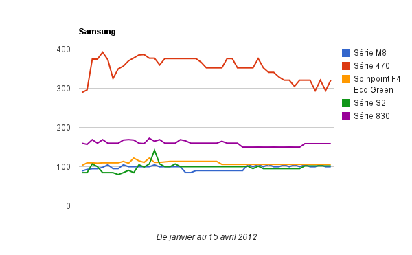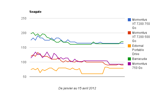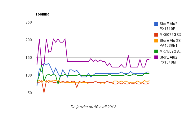 Les graphiques présentés ci-dessous retracent l’évolution des prix sur la période courant du 1er janvier au 15 avril 2012. Ils sont présentés à titre indicatif afin de constater une tendance, dans la mesure où le prix affiché sur chaque page de notre comparateur de prix est le prix le plus bas chez les différents marchands que nous référençons.
